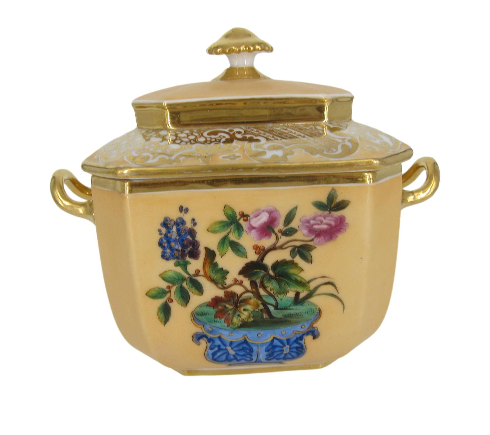 French Porcelain Cafe Au Lait Ground Sucrier & Lid with Chinoiserie Floral Decoration