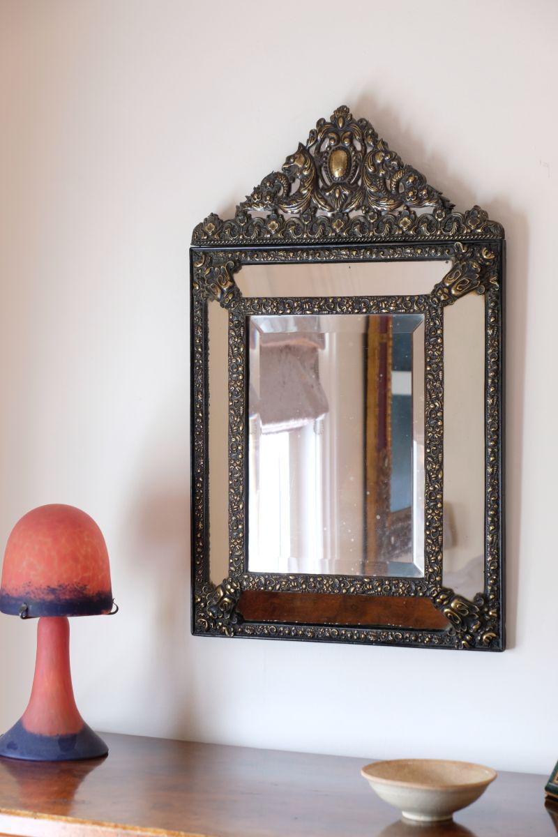 French Repousse Brass Cushion Framed Mirror with Arched Crest