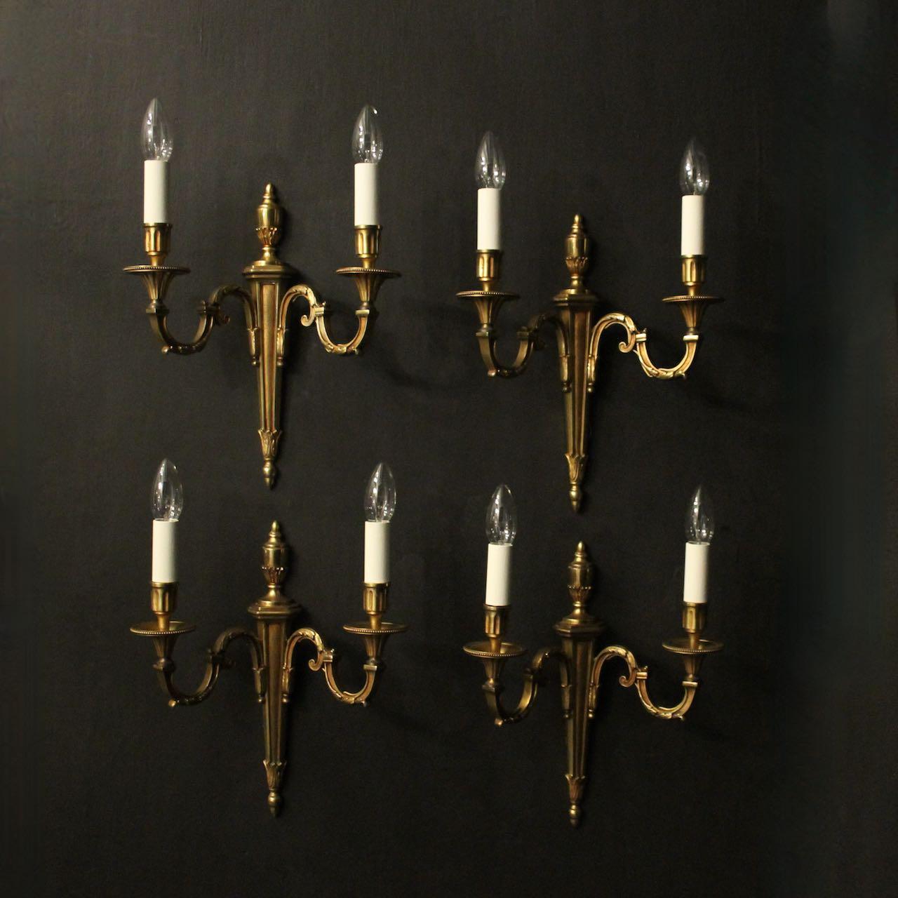 French set of 4 gilded brass twin arm antique wall lights, the leaf clad square gauge scrolling arms with trumpet reeded millgrain bobeche drip pans and reeded candle sconces, issuing from a leaf tapering backplate with urn finial. All stamped L.G for by Lucian Gau, great quality French lighting company.