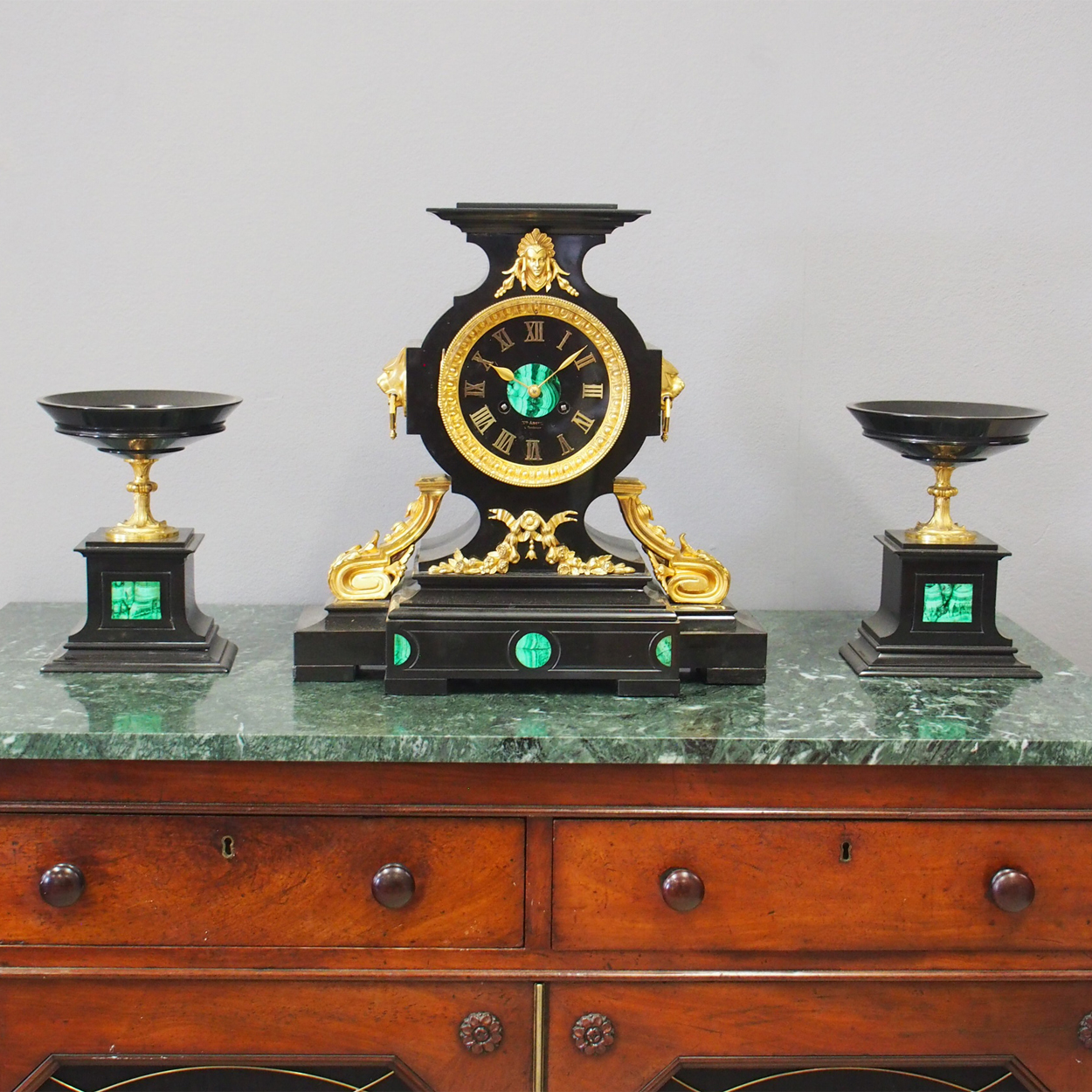 French Slate, Malachite & Gilt Bronze Clock Garniture c.1870 (1 of 17)