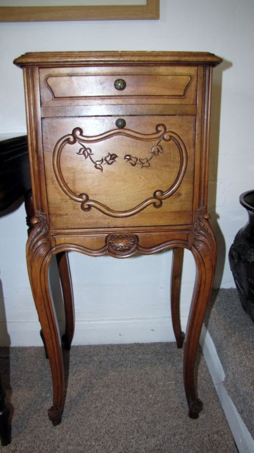 French Solid Carved Walnut Marble Top Bedside Cabinet / Cupboard c.1900