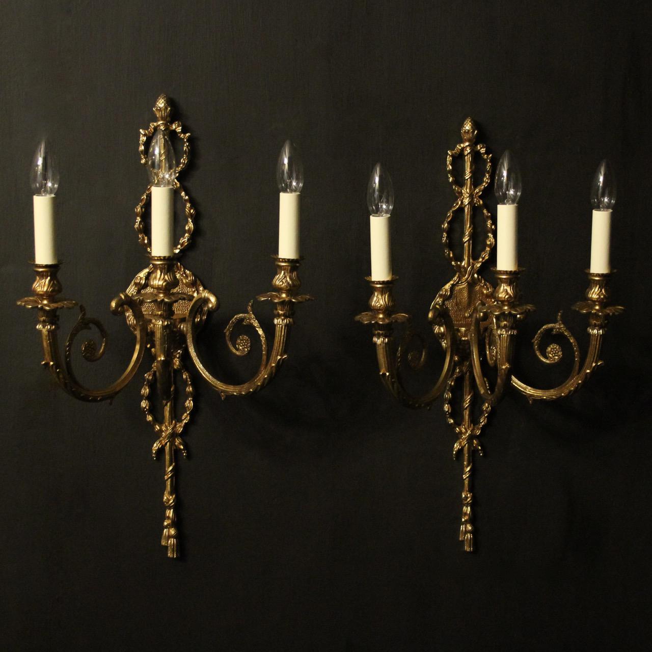 French Triple Arm Pair of Gilded Brass Wall Lights