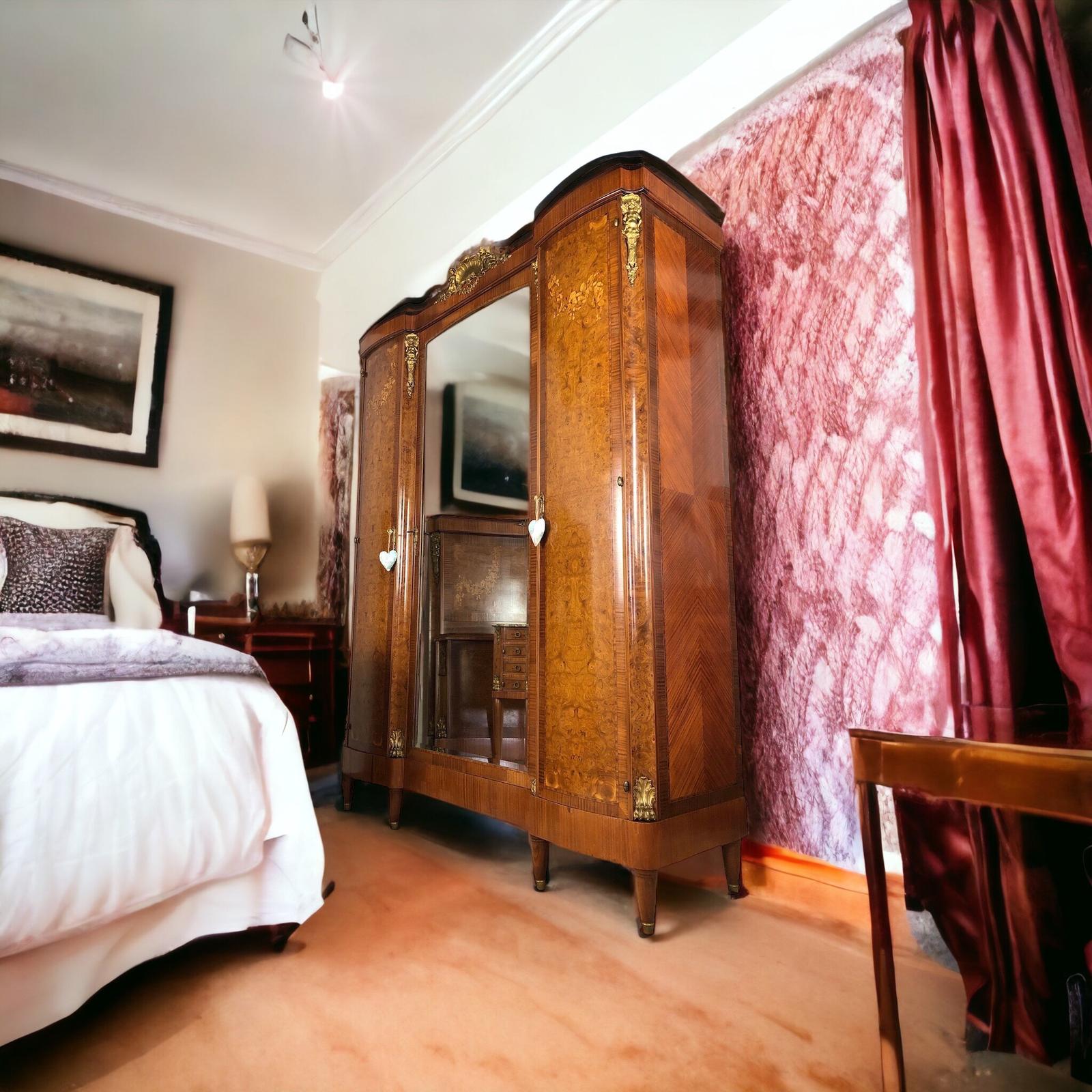 French Triple Armoire Wardrobe Floral Inlay & Ormolu Mounts