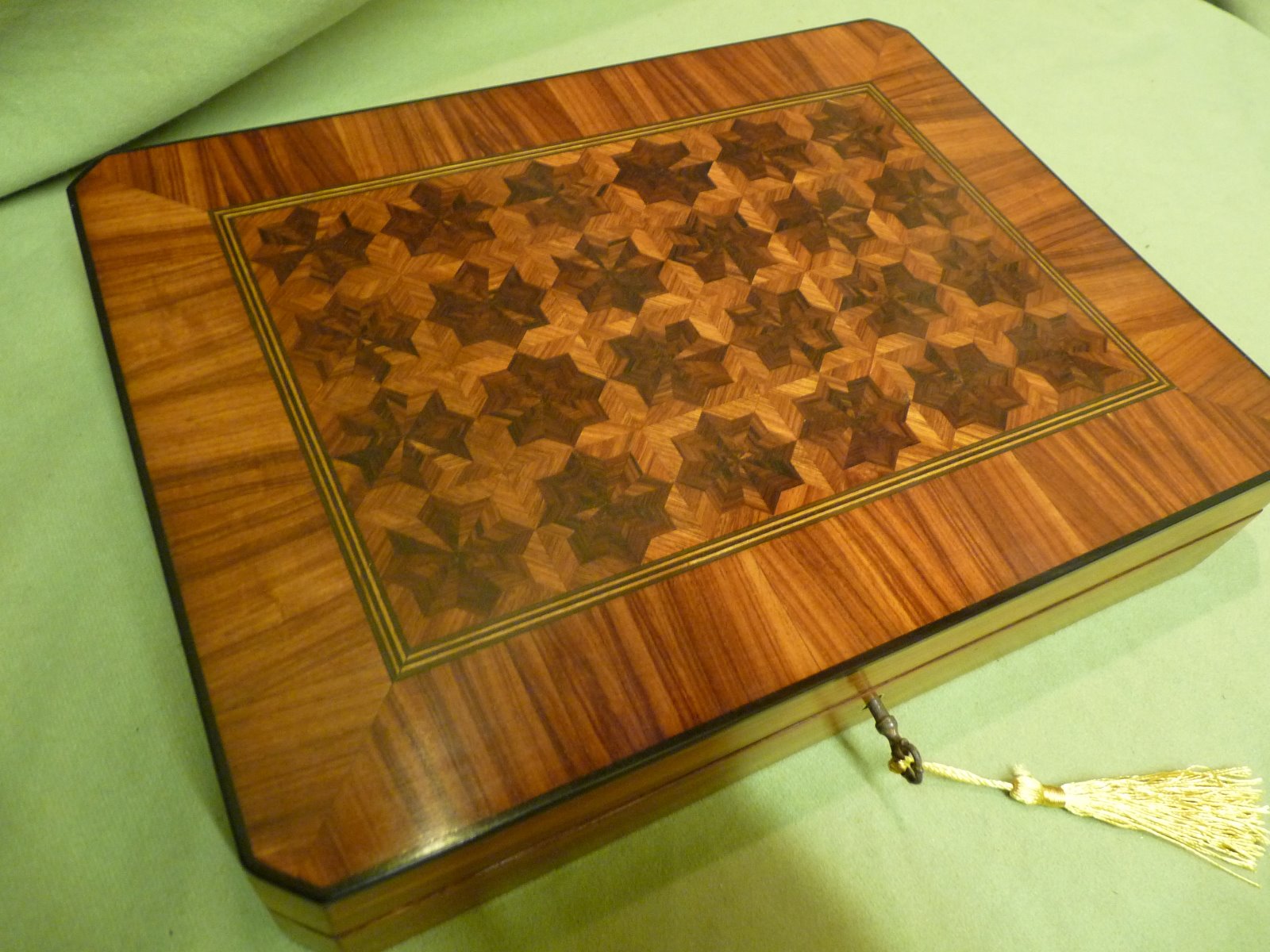 French Tulipwood Jewellery Box. Attractive Parquetry Panel c.1880