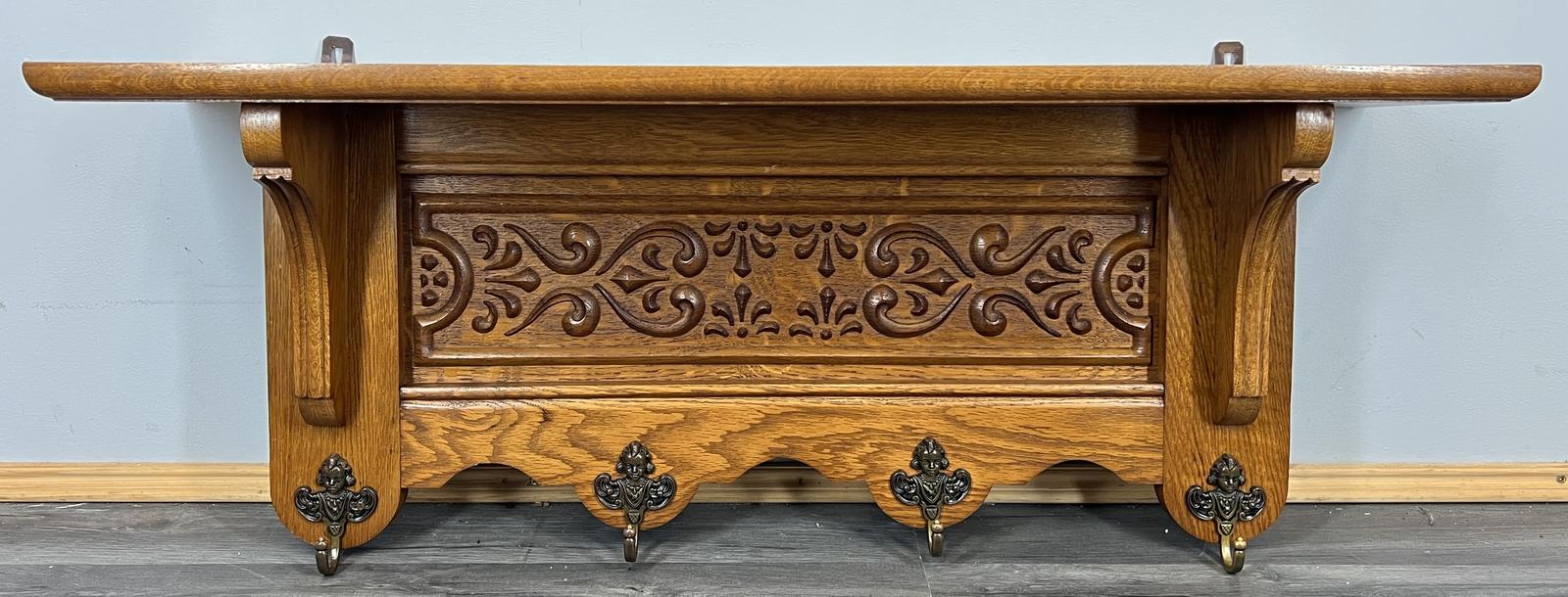 French Vintage Style Coat Rack Oak 4 Hooks Ornate Wall Shelf Coat