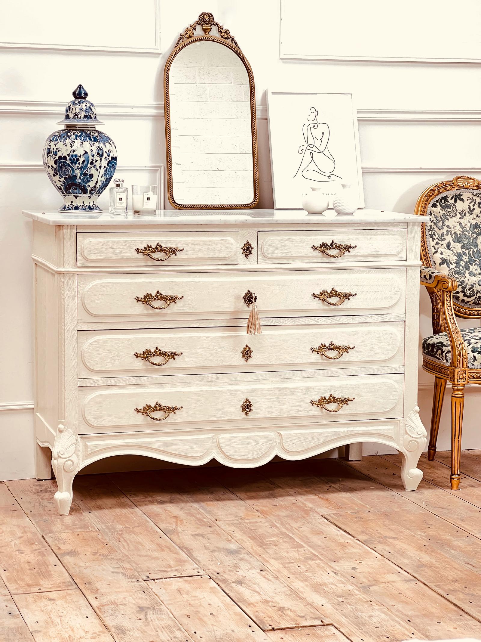 French Vintage White Chest of Drawers / Marble Chest