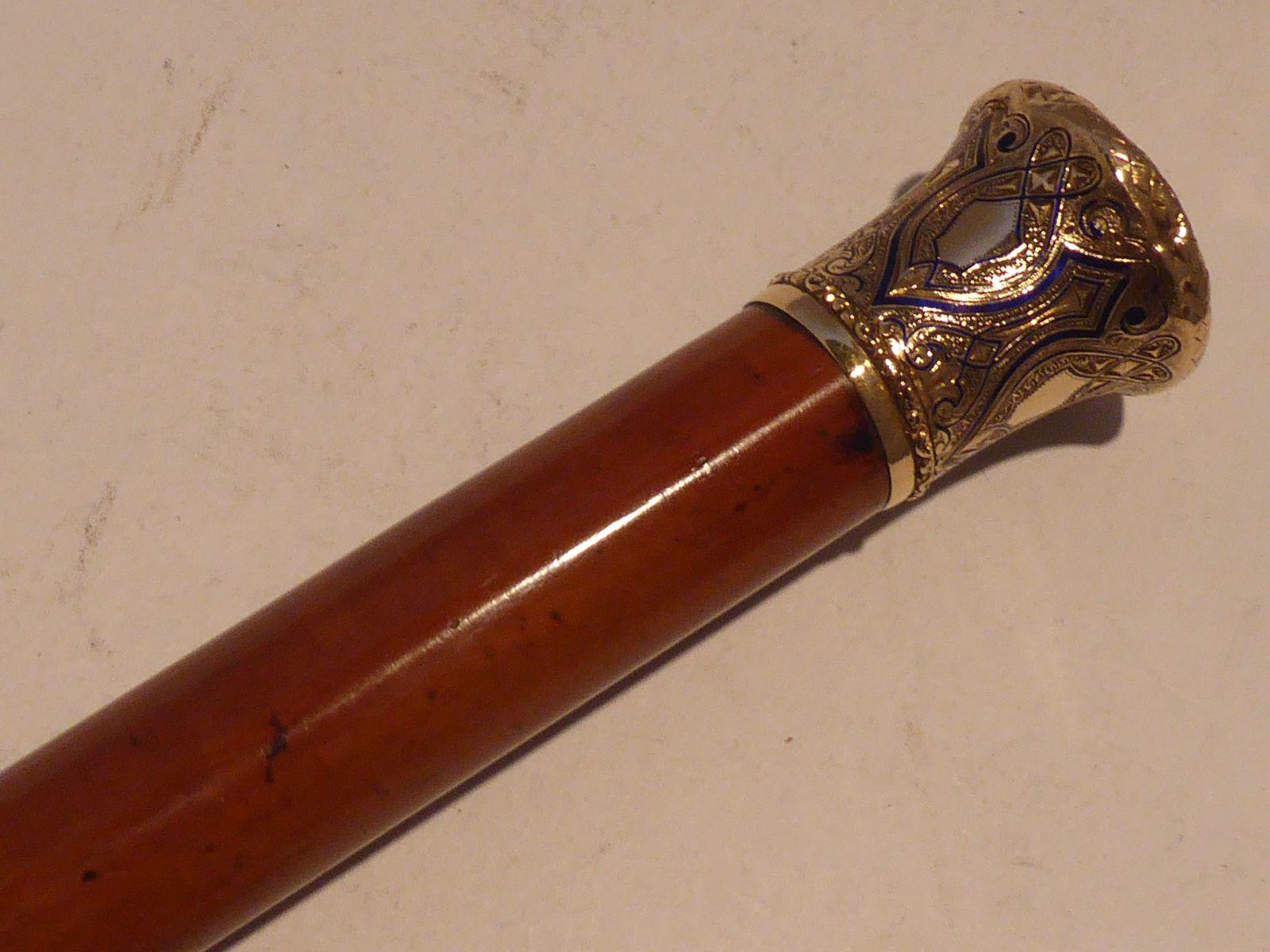 French Walking Stick Cane 18ct Gold Enamel Pommel Malacca Shaft c.1890