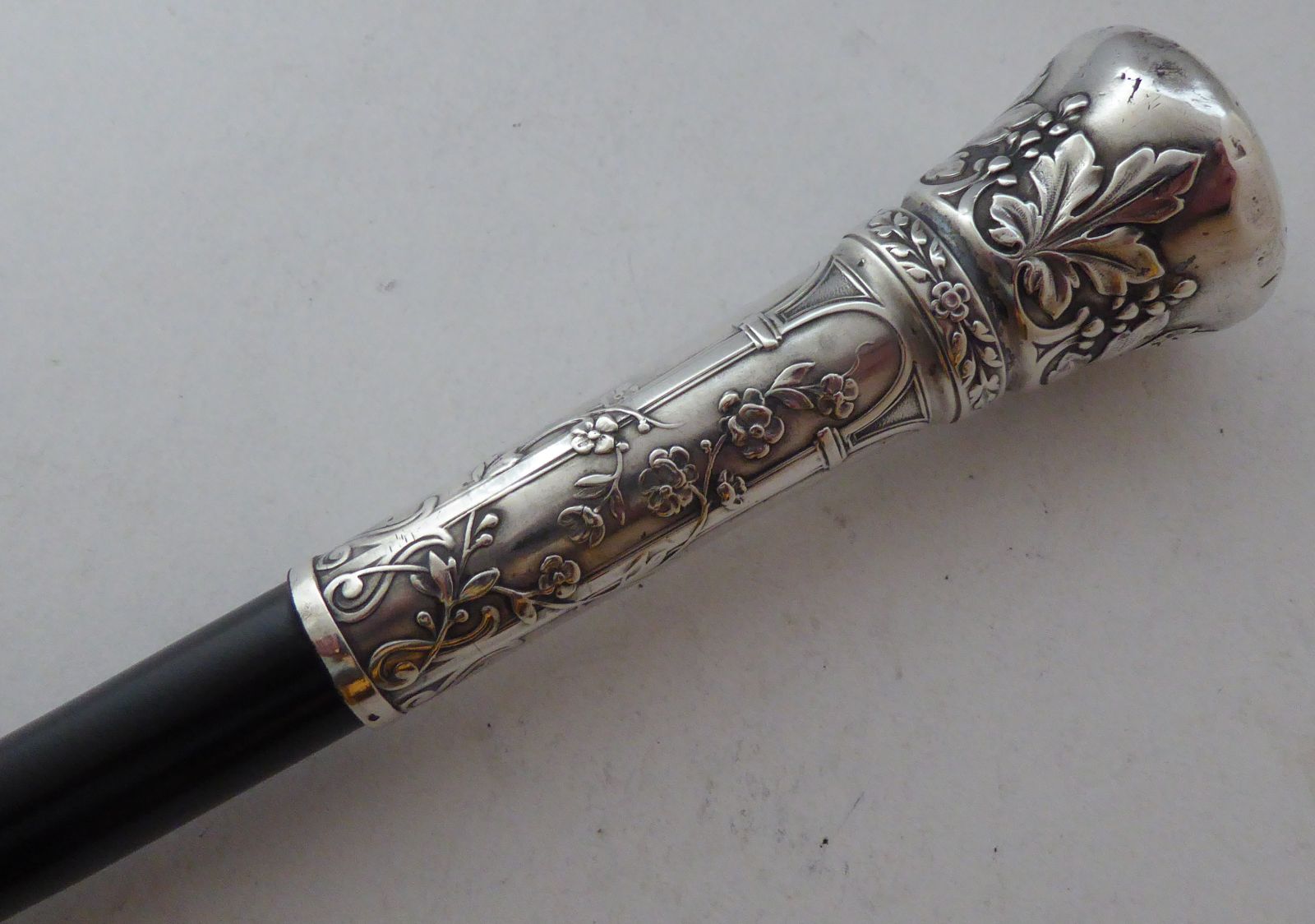 French Walking Stick Cane Solid Silver Pommel Ebonised Wood Shaft c.1900
