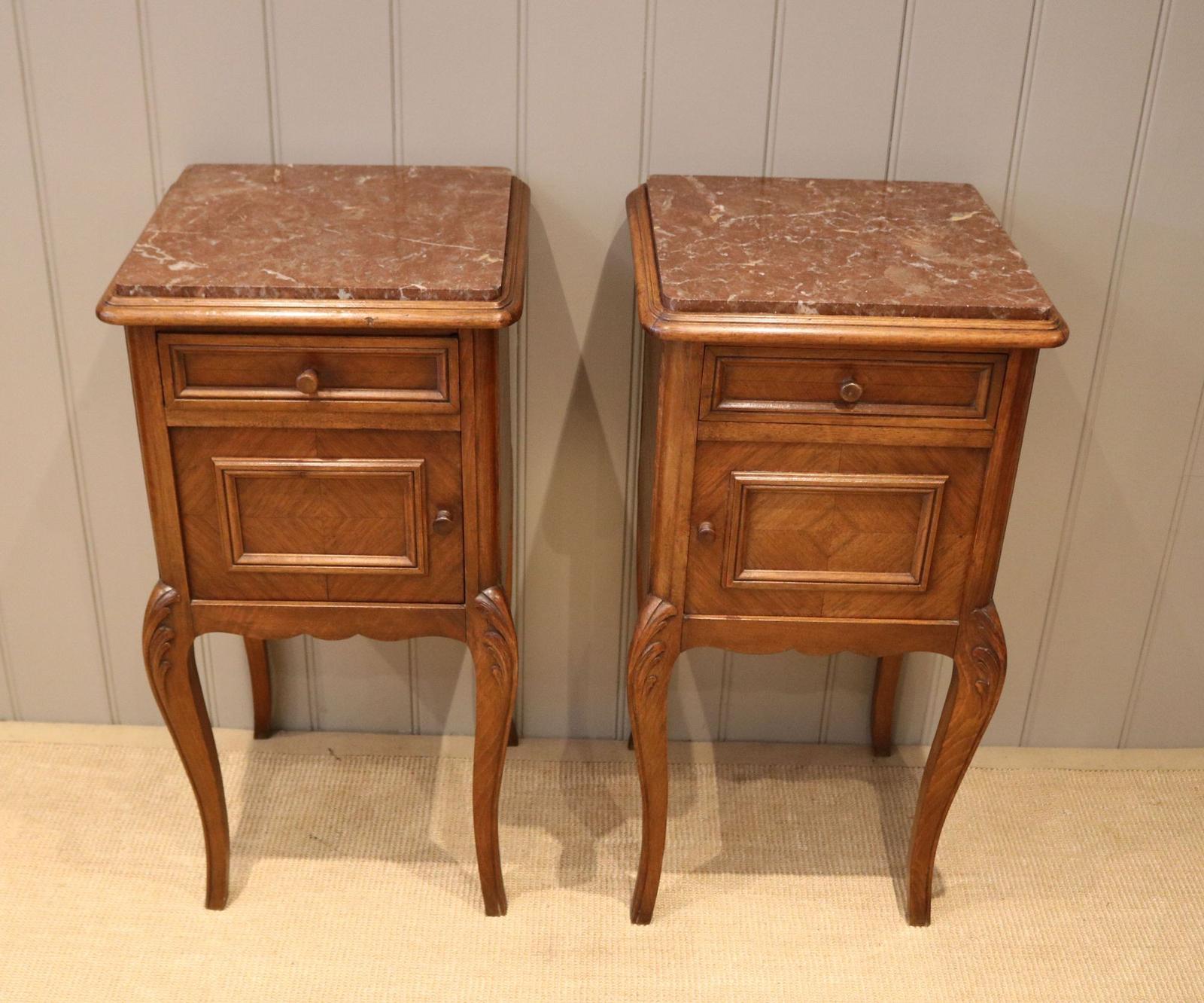 French Walnut & Beech Marble Top Bedside Cabinets