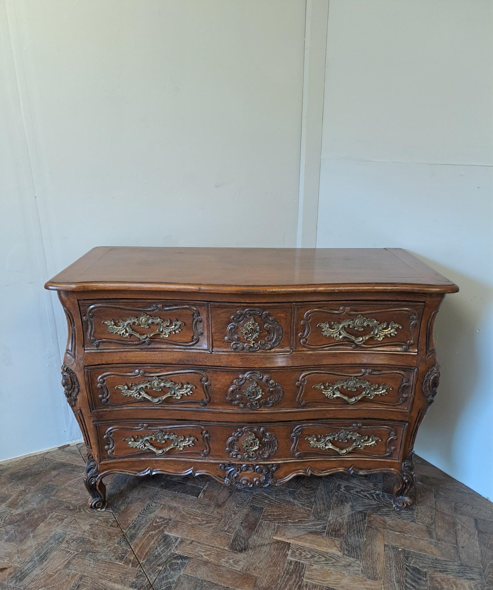 Constructed in solid walnut throughout, the commode features a gently bombé façade with three short drawers to the upper register over two long graduated drawers below, all framed by finely carved mouldings. The drawer fronts are adorned with rococo-inspired relief carving and fitted with ornate gilt-bronze handles and escutcheons, well modelled in the Louis XV taste.