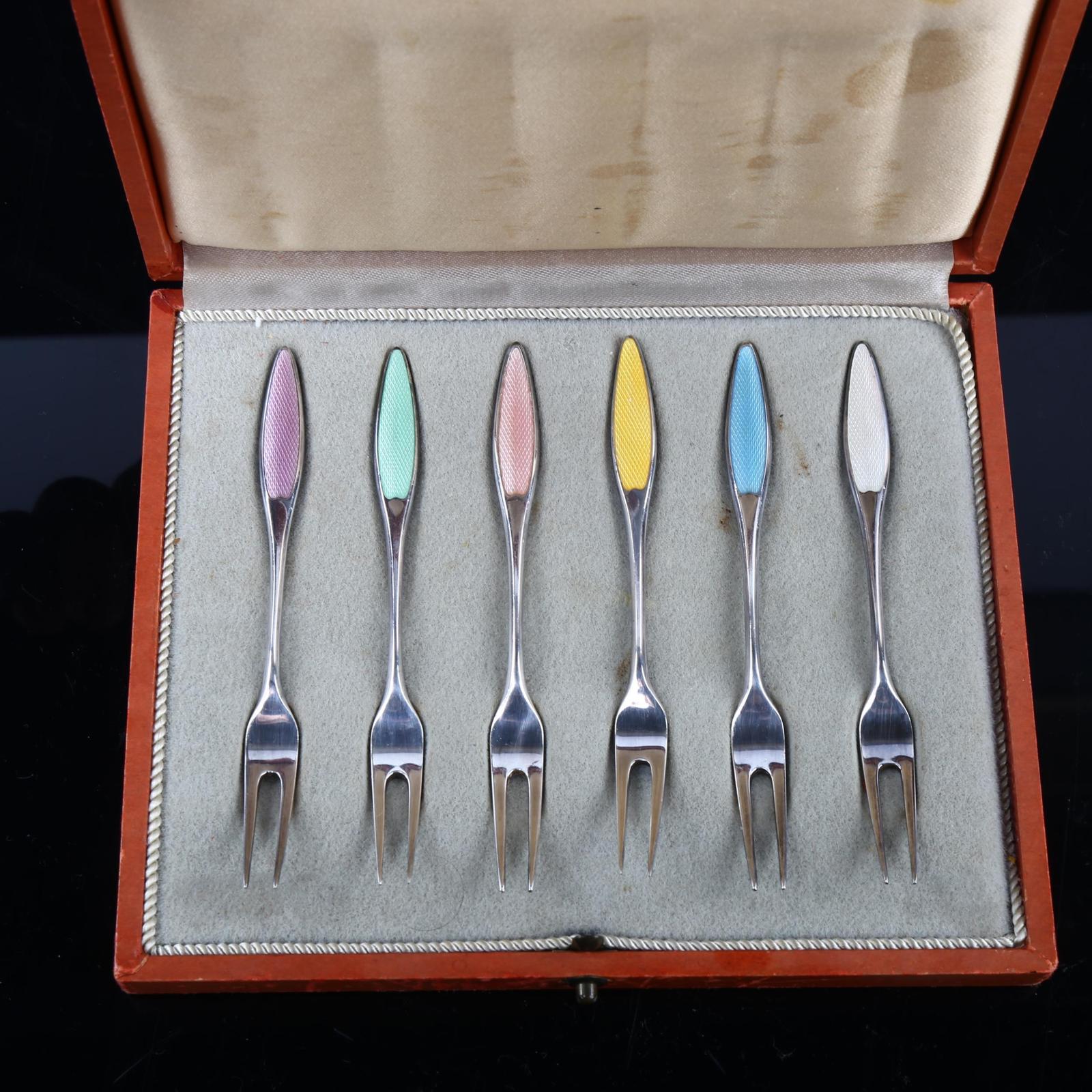 Frigast - Set of 6 Danish Sterling Silver & Harlequin Enamel Pickle Forks