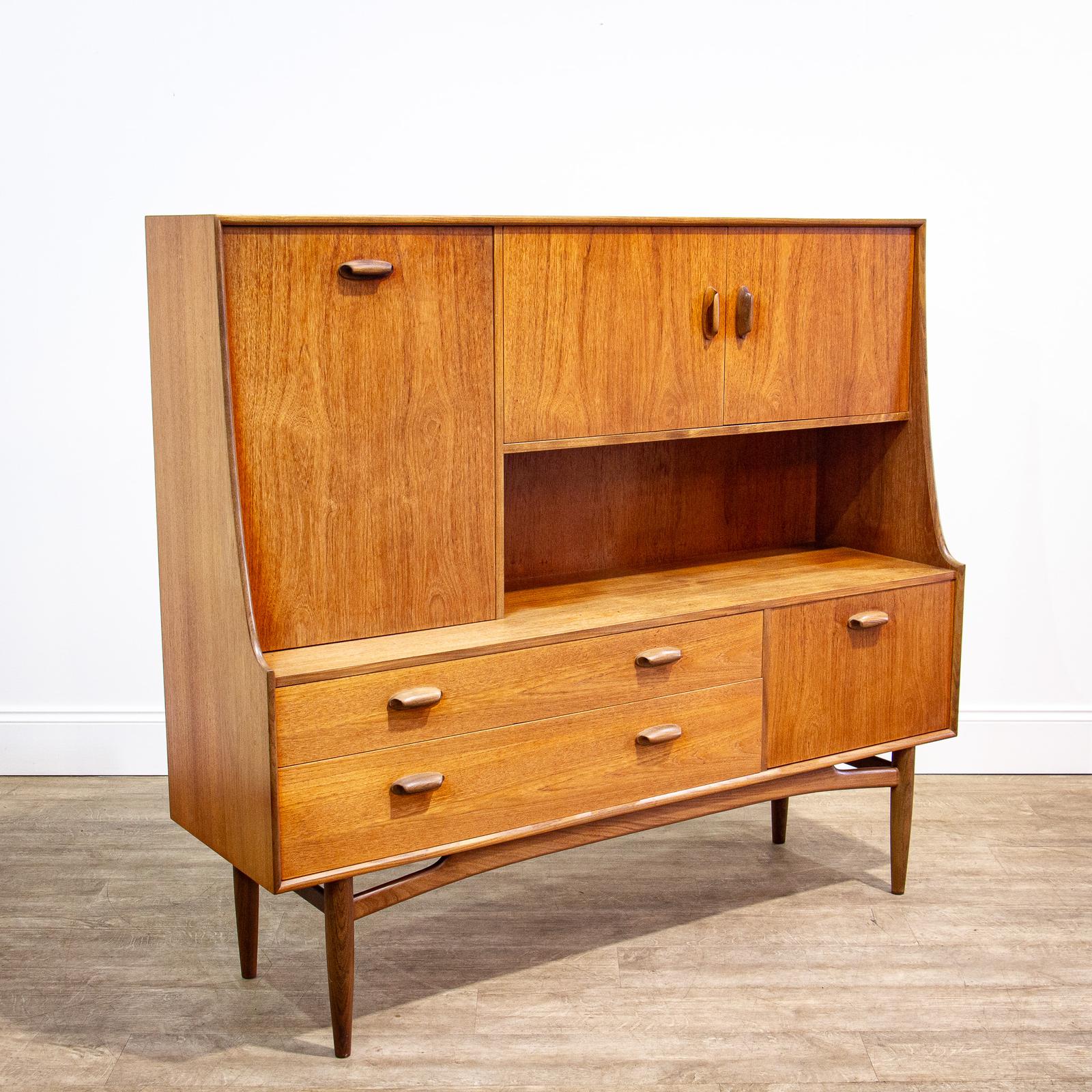 This teak highboard was made by the quality brand G Plan and has the E Gomme gold stamped label indicative of a date before the mid 1960s. It will look fabulous in a mid century interior and has plenty of storage, with room for cutlery and drinks, making it ideal for a dining room.