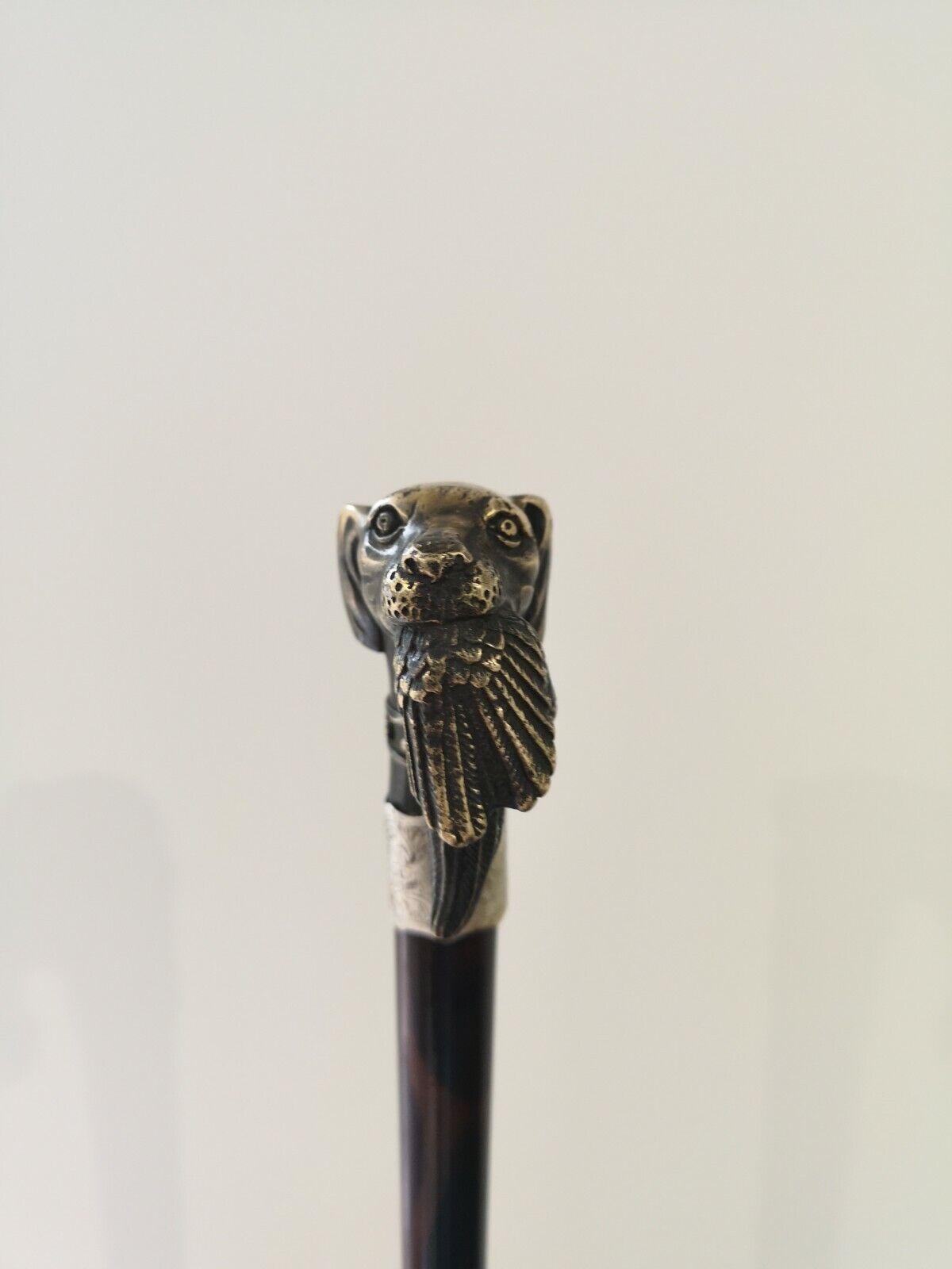Gentlemens Antique Walking Cane with Brass Hunting Dog & Pheasant - Hallmarks