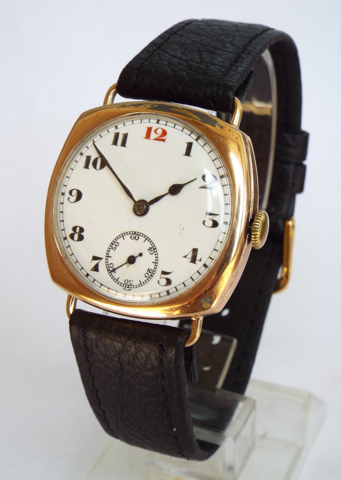 Gents 9ct Rose Gold Cushion Case Wrist Watch, 1929