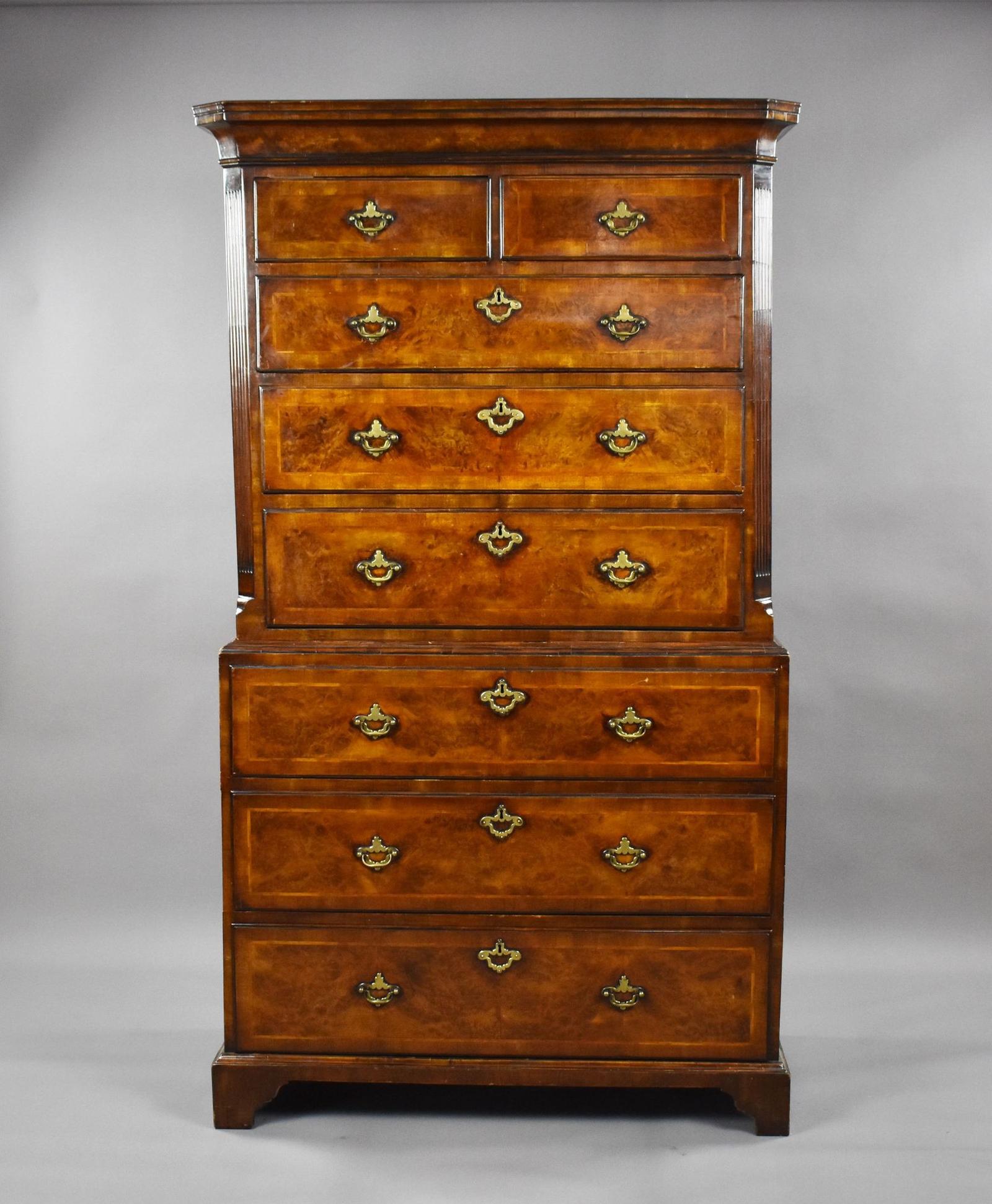 A handsome and well-proportioned George II chest on chest, beautifully veneered in richly figured burr walnut and displaying excellent colour and patina throughout. This fine early–mid 18th century piece combines elegant proportions with generous storage, making it both practical and visually refined.