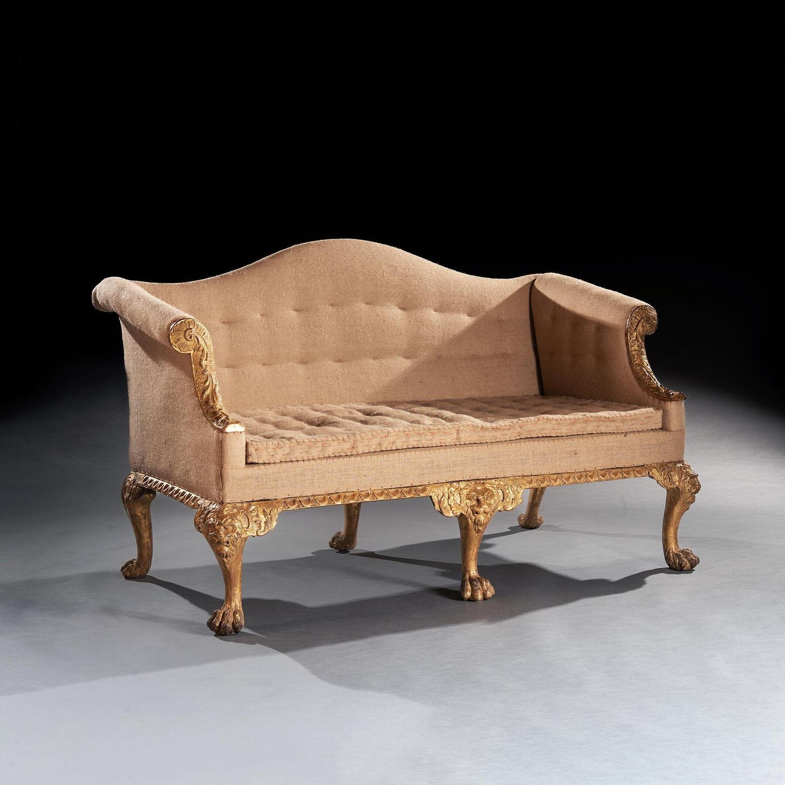 This exceptionally well drawn and important 18th Century (circa 1740) English antique settee is of the finest quality made from solid walnut which has been gilt. It is of camel back shape with deep, out-scrolling arm supports decorated with giltwood scrolling foliage. The seat rails with fine egg-moulded apron running between the bold lion mask knees and hairy paw feet connected by finely-shaped cabriole legs. In fine condition the giltwood of the sofa has been cleaned and refreshed showing signs of period gilt work beneath the surface, having been re-upholstered it is now ready for is finishing material.