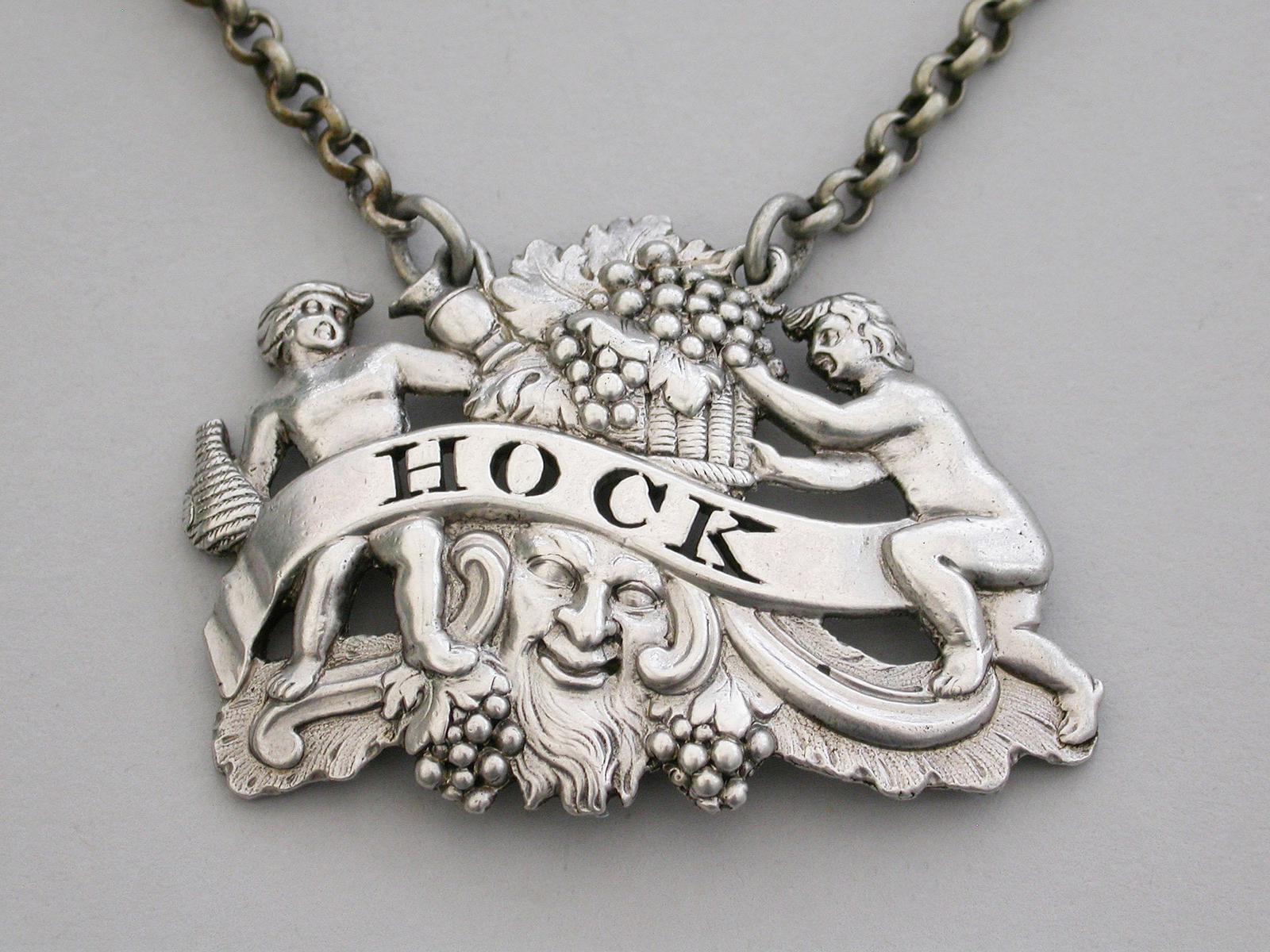 George III Cast Silver Two Putti with Jug & Bottle Wine Label 'Hock' by Phipps & Robinson, London, 1806