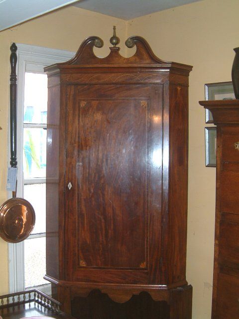 George III Inlaid Corner Cabinet with Swan Neck Pediment