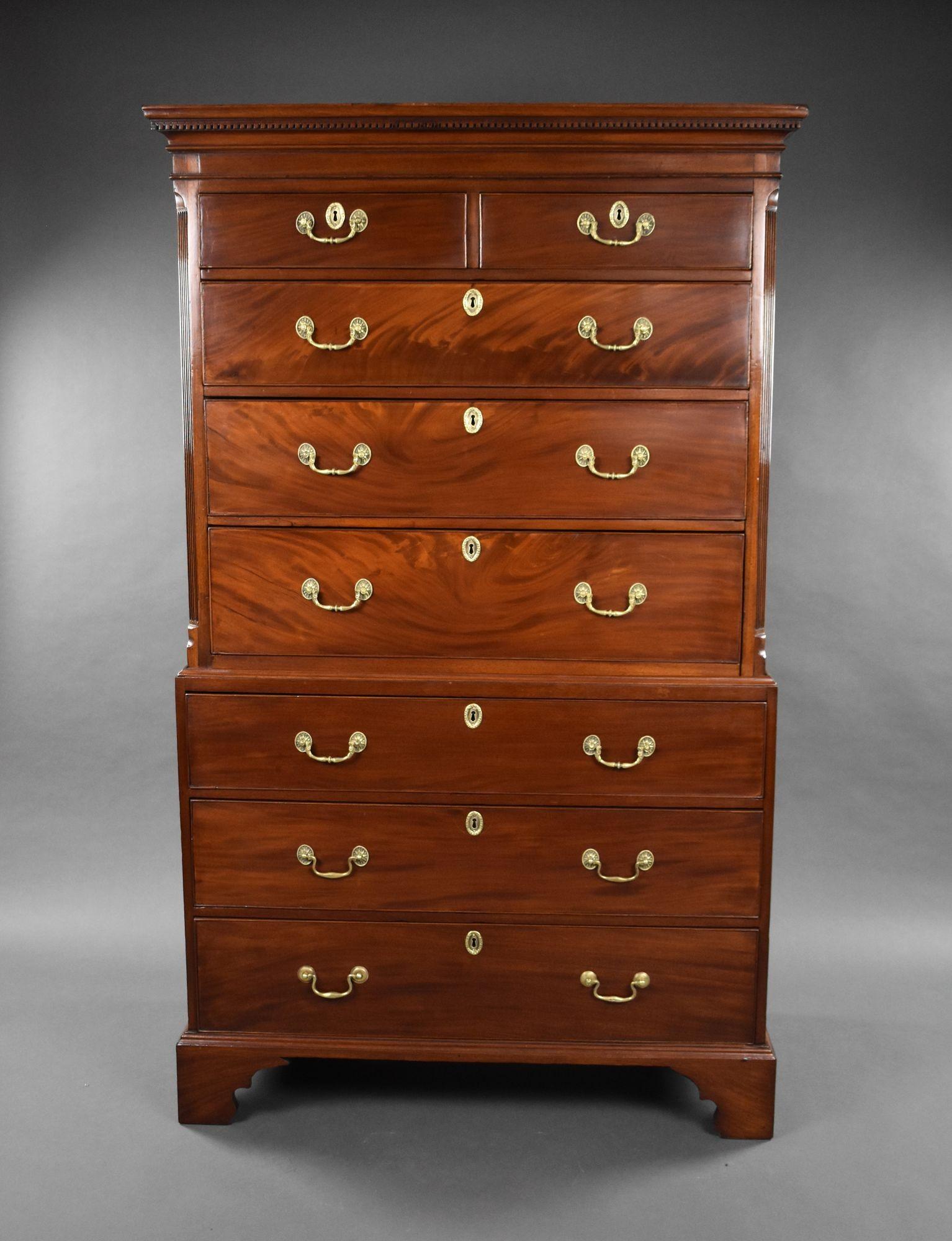 A fine George III mahogany chest on chest of elegant proportions, dating to the late 18th century. Constructed in well-figured mahogany, the piece is arranged with two short and three long graduated drawers to the upper section, over a further three long drawers to the base. Each drawer is fitted with period-style brass swan neck handles and