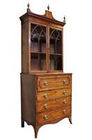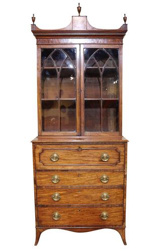 A George III Mahogany Secretaire Bookcase the shaped pediment with turned urn finials, with gothic astragal glazing to the front opening to two internal shelves, the first drawer opening to reveal an interior with fitted compartments, and three further drawers beneath, terminating on splayed feet