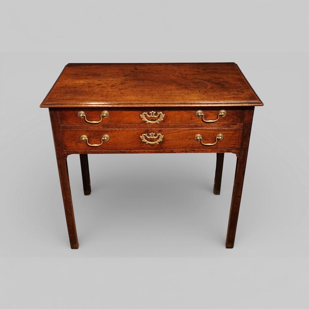 • The top is a single-piece timber selected for its interesting grain and figure, giving the surface exceptional visual depth. The case houses two well-proportioned drawers fitted with original brassware, while the legs are chamfered square in section — the classical form associated with mid-18th century English design — rising to subtle shaped brackets at the top of each leg, a delicate and well-executed detail. Overall proportions are neat and practical, with crisp moulding to the top edge and excellent colour developed with age.