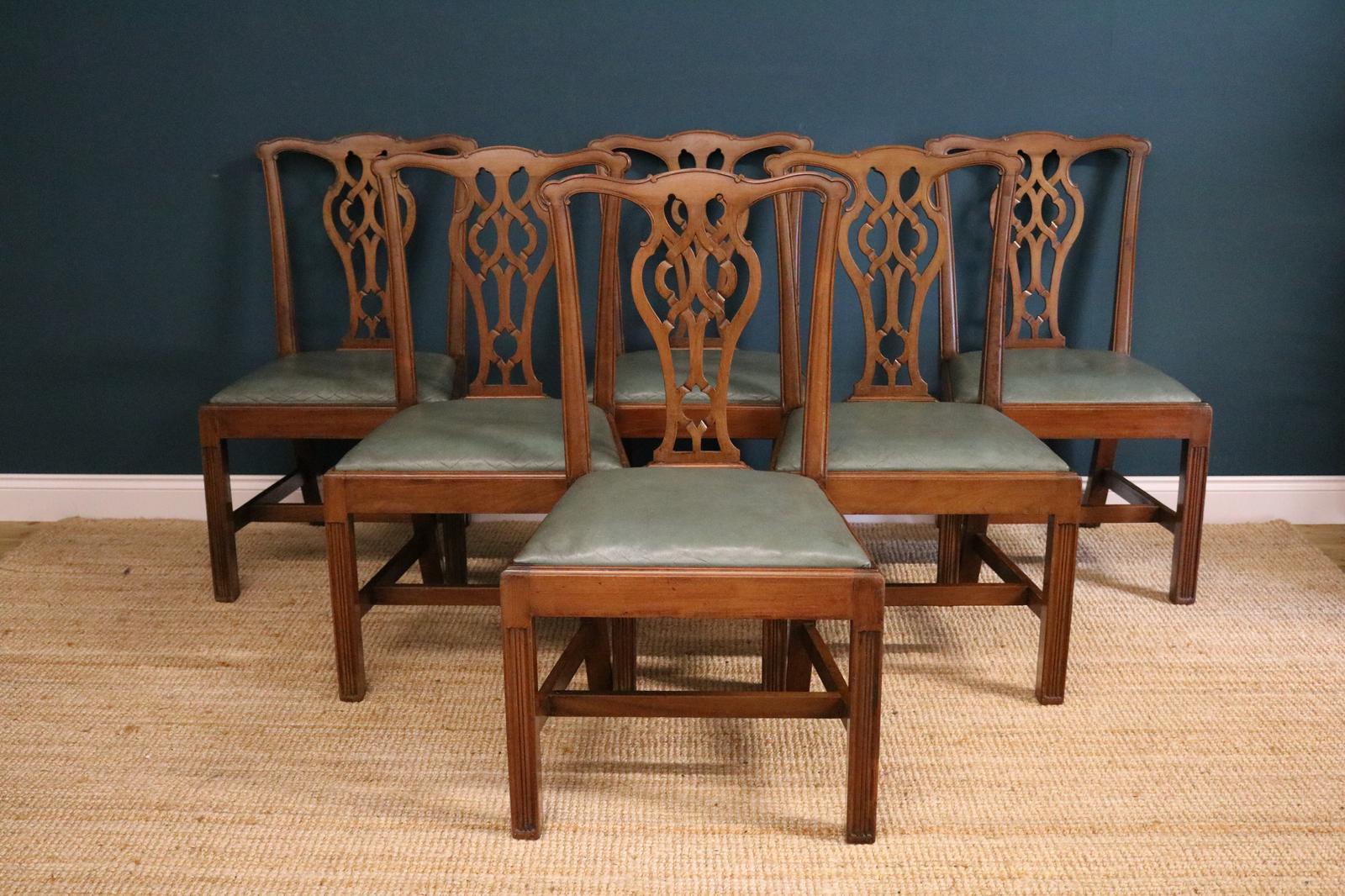 A set of six George III style mahogany dining chairs with drop-in leather seats, perfect for adding classic elegance to your dining space. These vintage pieces blend timeless design with comfort, making them a distinguished choice for collectors and enthusiasts alike. Discover the charm of authentic antiques at Wilsford Antiques