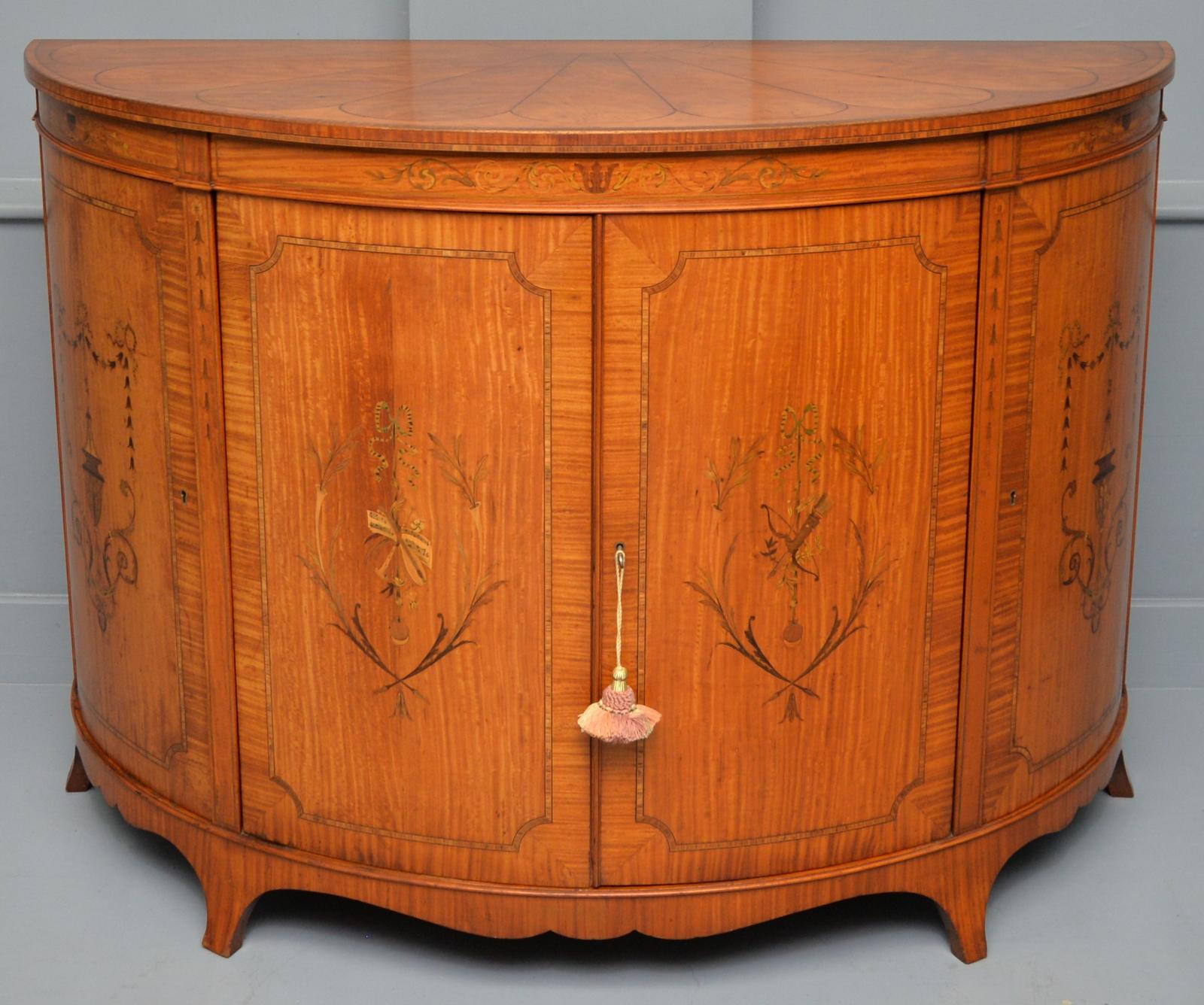George III Style Satinwood Inlaid Demi Lune Commode Cabinet - Cowtan & Sons London