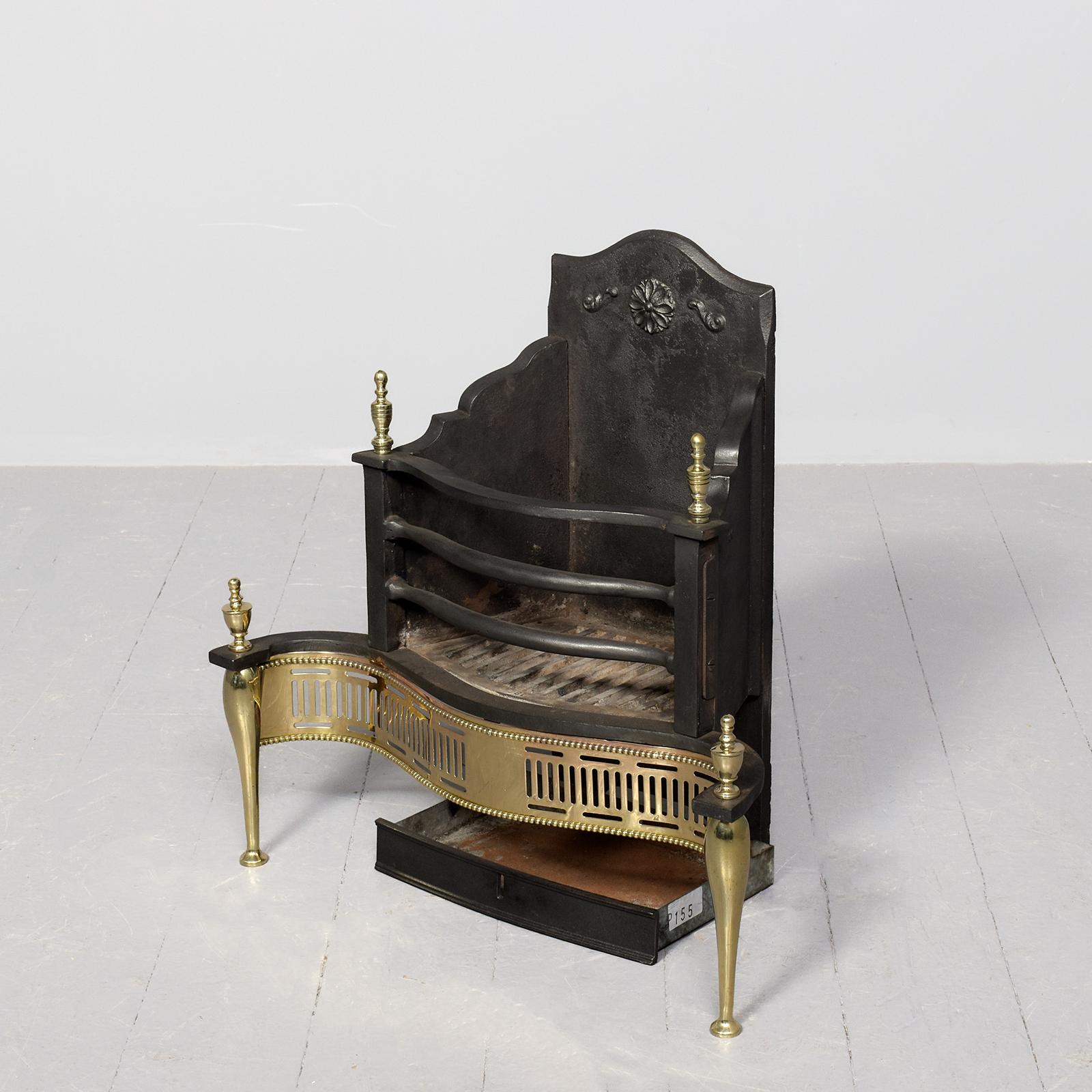 Circa 1900. A George III style steel and brass serpentine fronted fire grate of diminutive proportions, the cast back with foliate casting in the centre, the serpentine front surmounted by a pair of cast brass finials, with the slatted floor beneath, the serpentine front with pierced and embossed brass facing, the ends with brass finials, resting on a pair of brass legs finishing on turned toes, the back on a solid base with a small ash pan beneath.