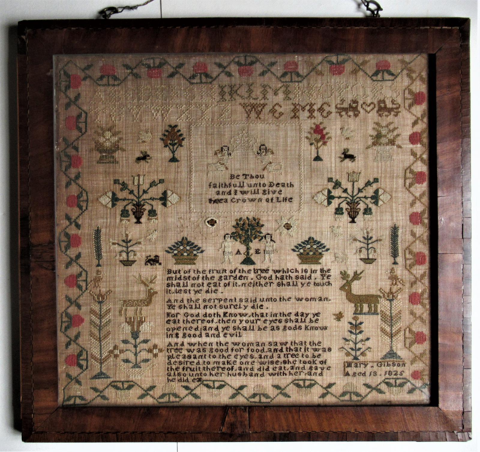 George IV English Adam & Eve Silk on Linen Needlework Sampler, 1825 in Original Frame