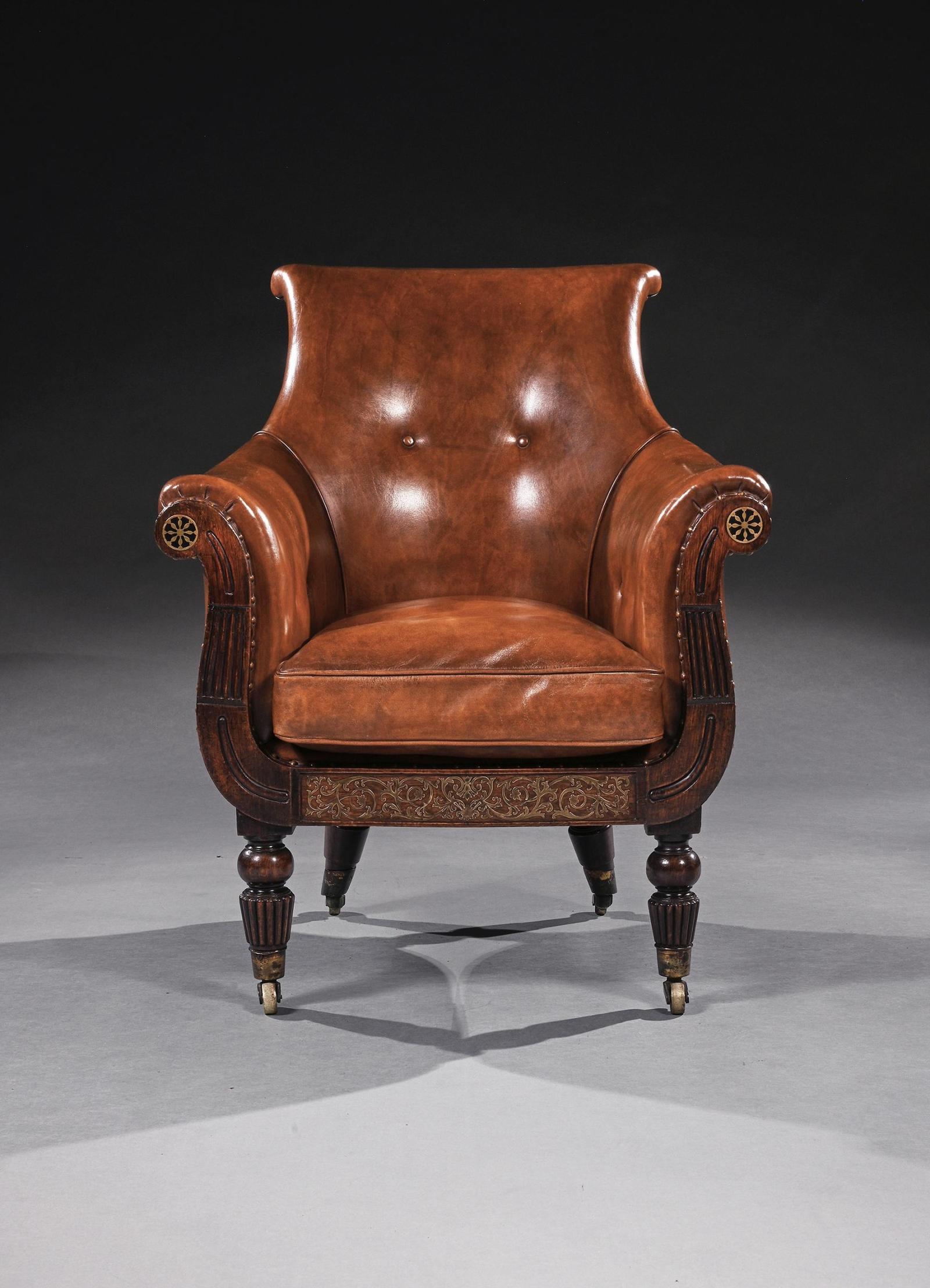 George IV Period Gillows Simulated Rosewood & Brass Inlaid Leather Library Bergere Armchair