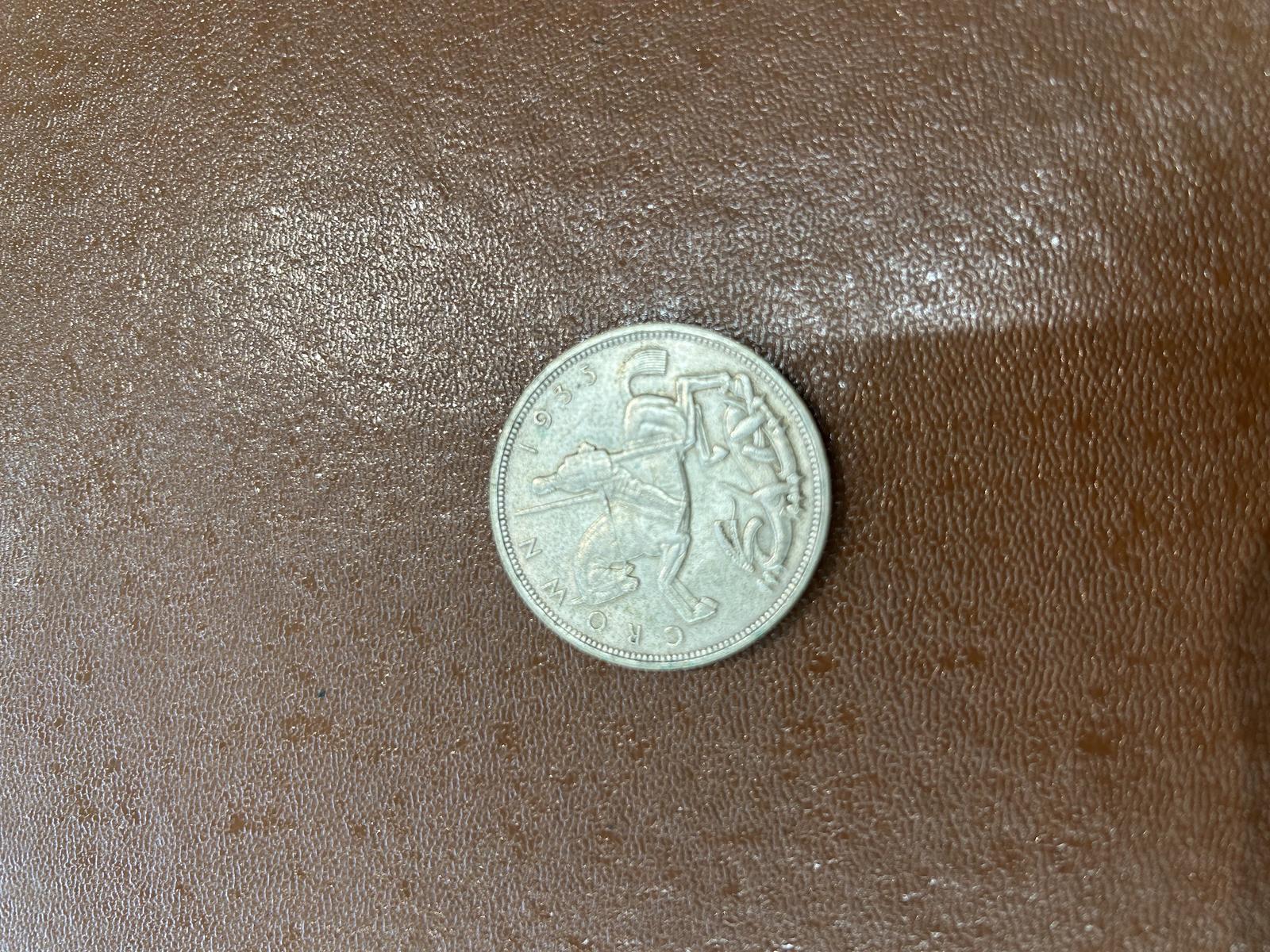 George v Jubilee crown. 28.2 grams. C.1935. Measurements: height 4cm, width 4cm, depth 0.3cm. Half silver.