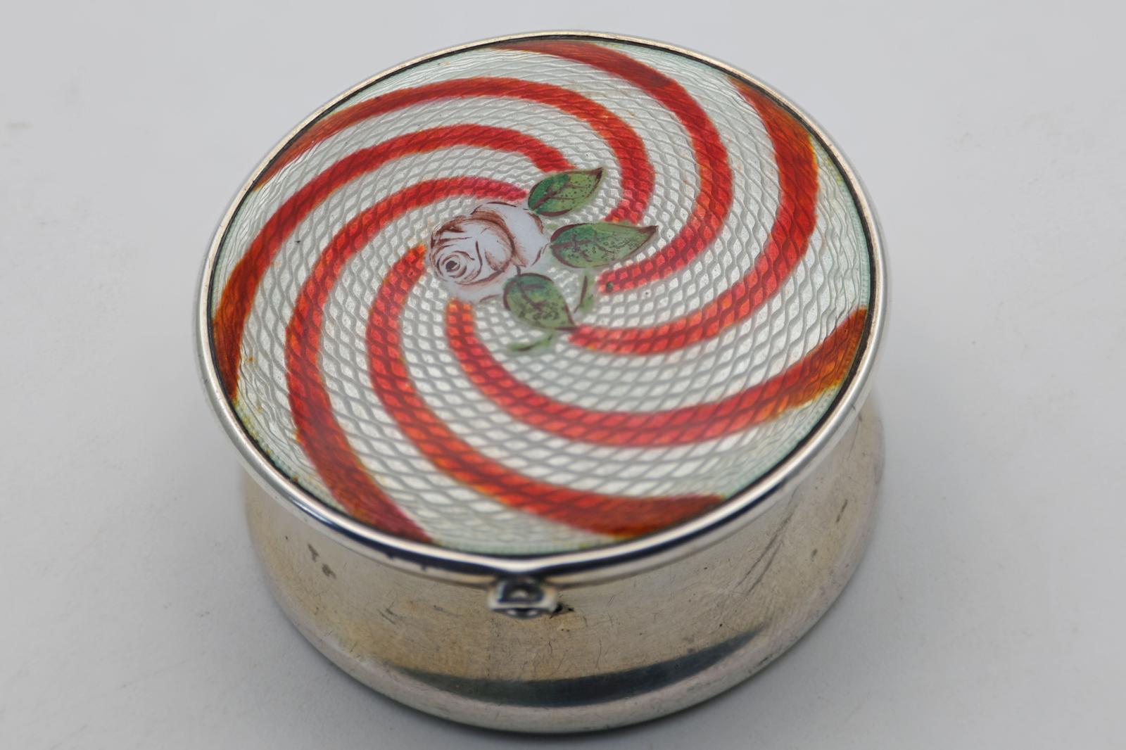 Very pretty silver box with the top enamelled in white with red swirls like candy canes. The centre has leaves and a flower. The lid opens with a diamonte knob. Hallmarked for Henry Greaves, Birmingham, 1911. Diameter 4.5cm, weight 28gm