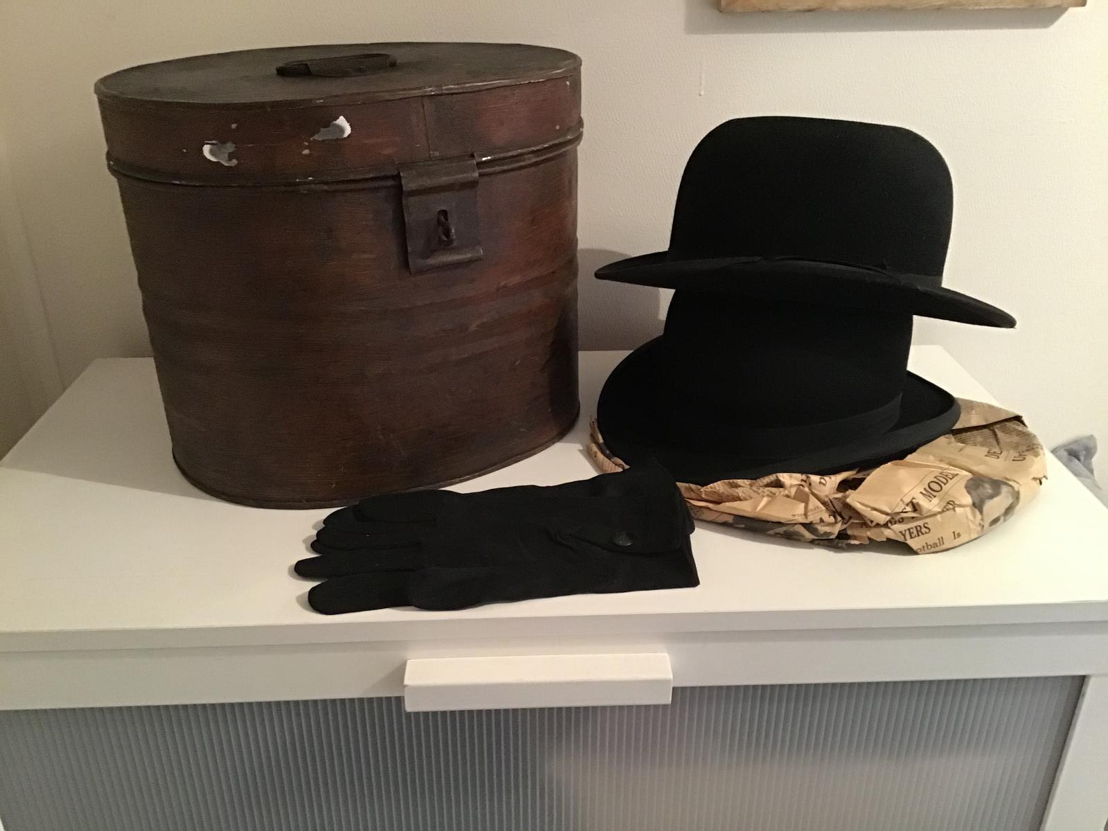 George VI Metal Hat Box with Two Bowler Hats and Gloves
