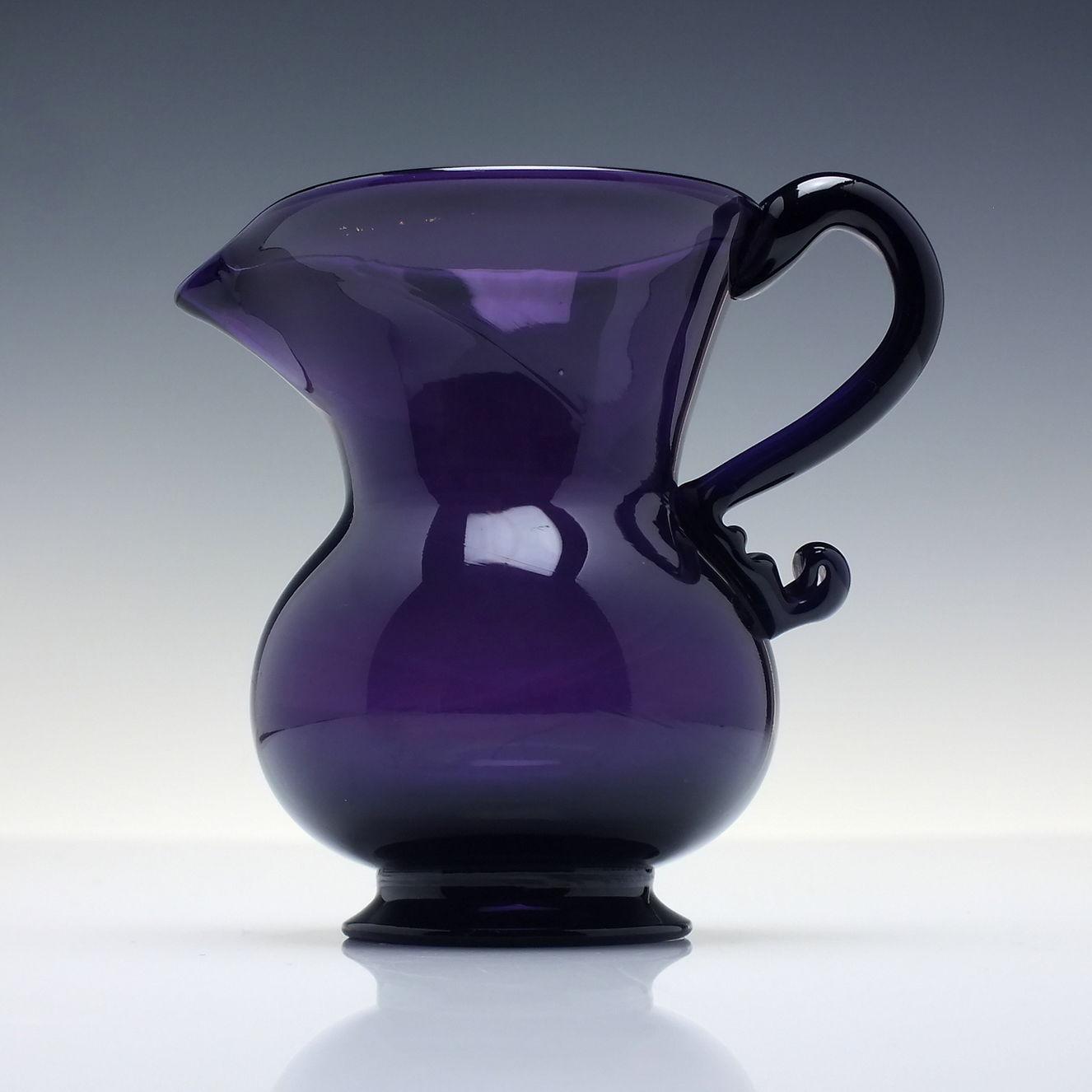 A beautiful amethyst glass cream jug produced around c1800. It has a squat baluster ‘pot belly’ form with a pinch-pulled lip. An applied ‘scroll kick’ handle with a pinched terminal. Rough pontil to the footed base.