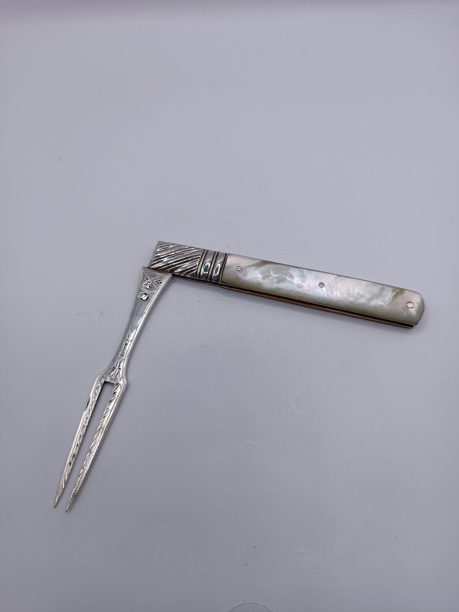 Georgian Antique Sterling Silver Folding Traveling Fruit Fork Mother of Pearl
