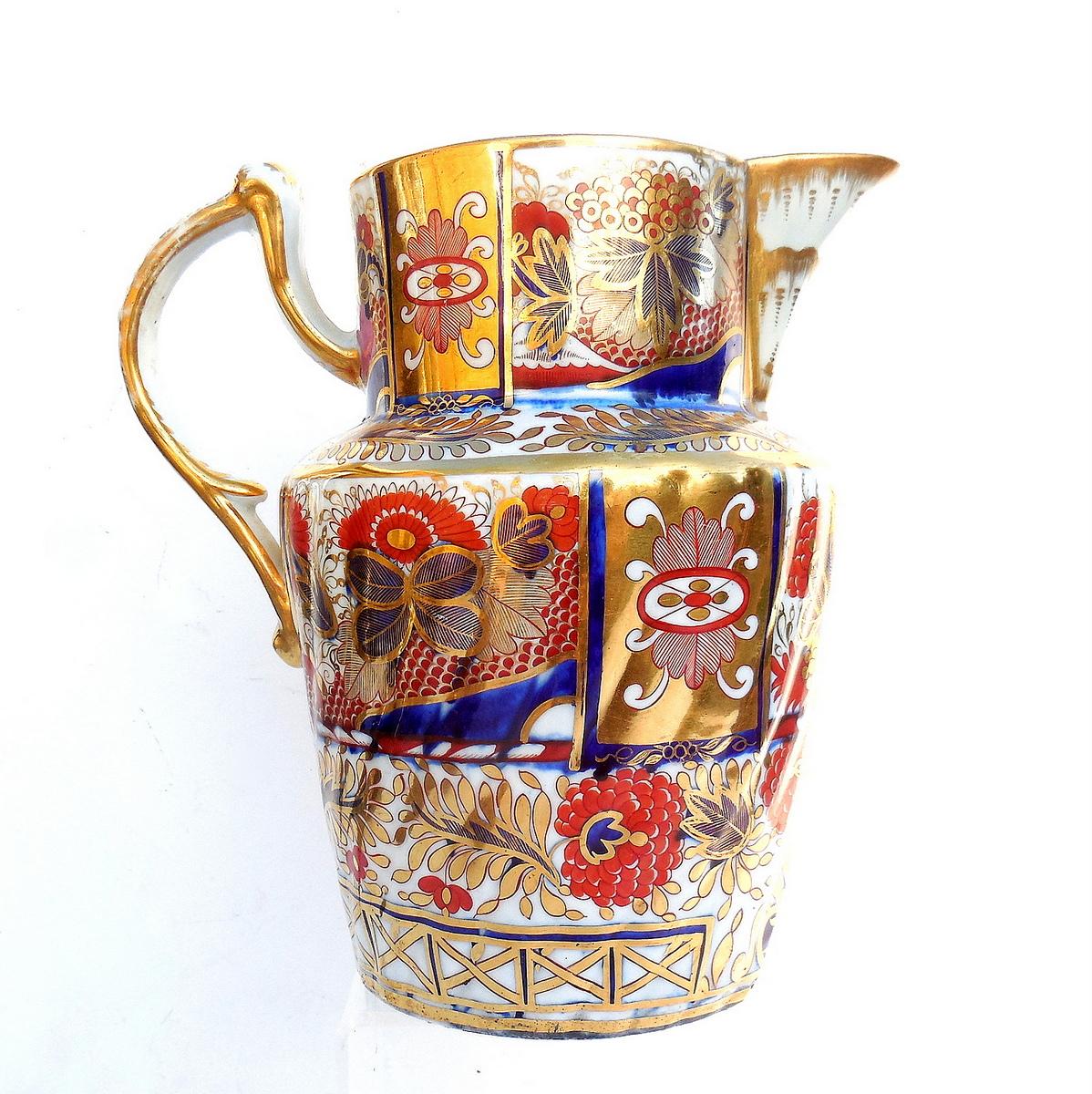 For sale is a antique Georgian jug made by Chamberlains Worcester in the early 19th century around 1805-1810. I believe the pattern is called "Old Japan" or 'Nelson's Pattern' and is one of the most desirable patterns from this period of English ceramics. The jug is about 20 centimeters tall and weighs about 775 grams. The condition appear to be good with some gilding wear to the handle and top rim as well as some minor glaze crazing on the underside foot rim. Otherwise minor wear only.
