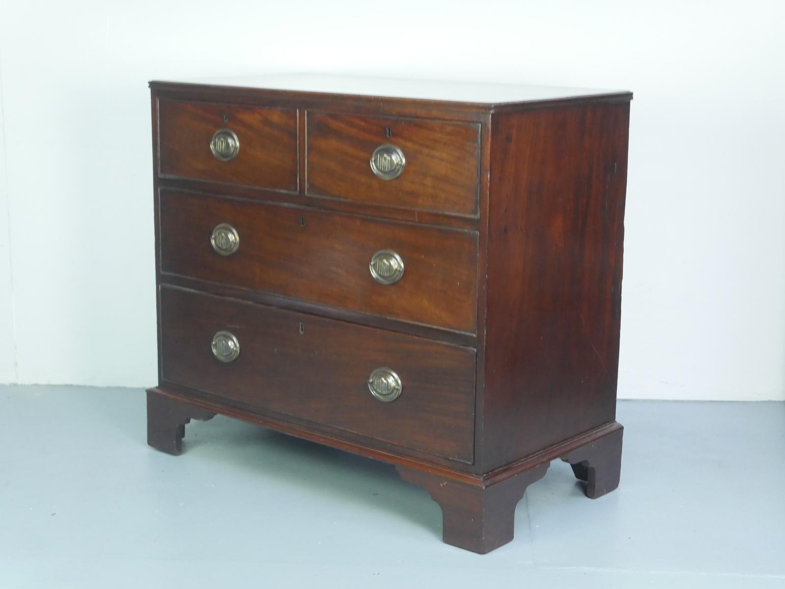 A very useful 18th century mahogany chest of two long drawers with two short drawers above, oval brass handles, standing on strong bracket feet. The chest is in good strong condition, free running drawers and ready for use.