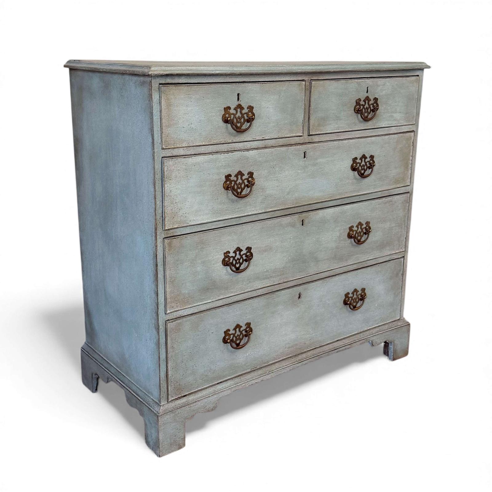 Late 18th century Georgian straight fronted chest of drawers with original brass handles, solid timber construction and a sympathetic icy mottled blue specialist paint finish