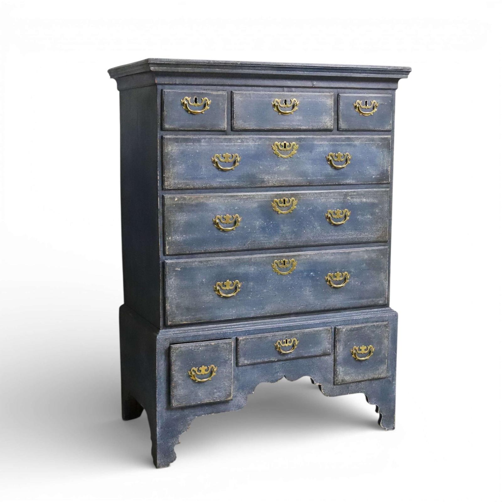 A handsome Georgian chest on stand of strong architectural form dating to circa1760-1780, later hand painted in a specialist distressed mottled chalky blue finish - retaining its original proportions, strong cabinetwork construction and brass hardware