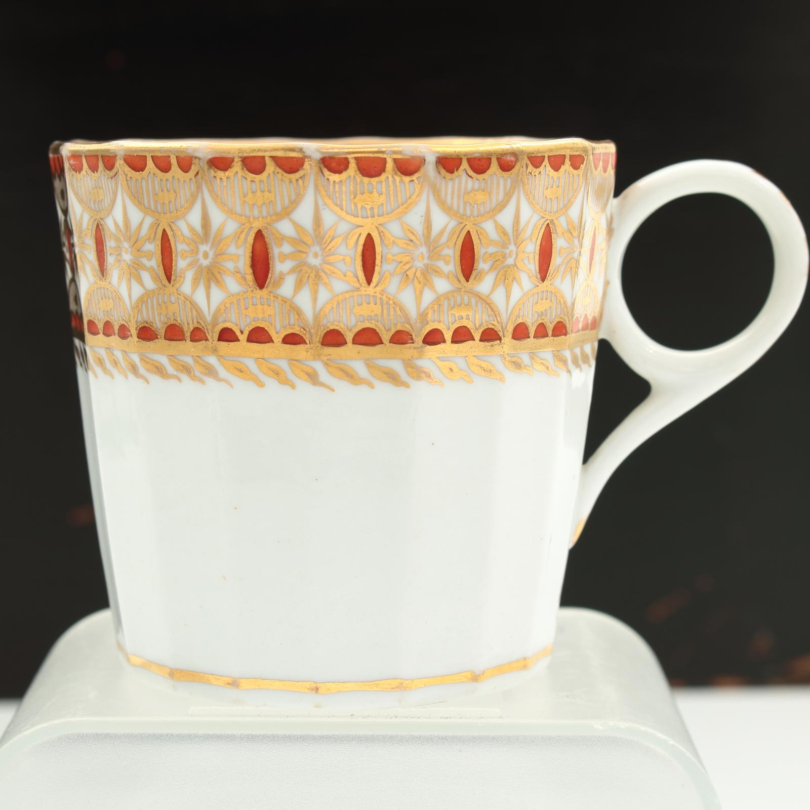 An English Georgian Coalport coffee can beautifully decorated with a band of red and gilt motifs on a faceted body, unmarked, attributed to John Rose Coalport factory, late 18th Century / early 19th century.