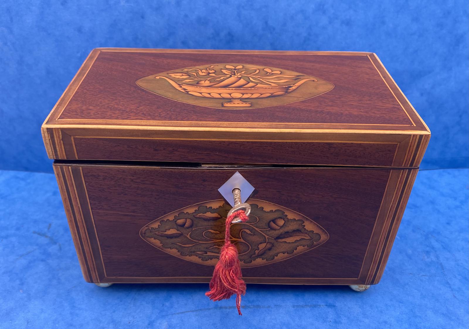 Georgian Mahogany Tea Caddy with Harewood Floral Panels