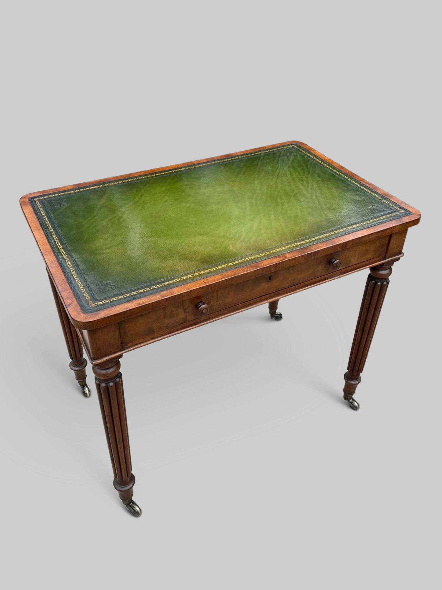 An elegant Georgian writing table attributed to the cabinetmakers Gillows. The table displays a lovely green leather hide which has been hand stained and is decorated with gold tooling which enhances its appearance. There are three retractable writing extensions/slides for additional space, a known Gillows feature, often found on their more functional writing tables and library pieces. The table displays four reeded legs which terminate in original brass casters. This item has been fully restored and French polished in our own workshop which creates wonderful colour and patination.
