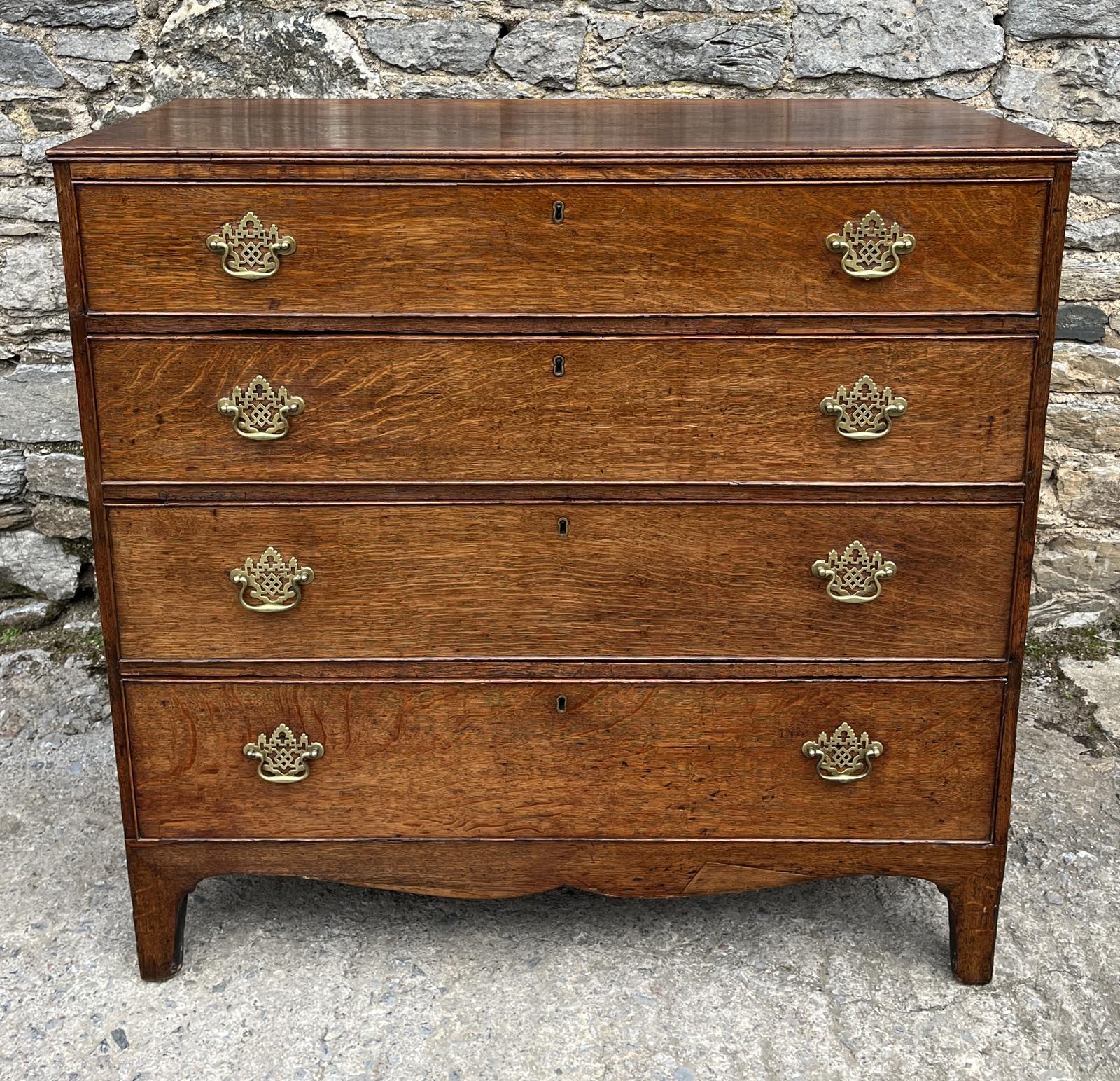 A good oak chest of drawers dating from the early 19th Century. It has a nice arrangement of four long drawers with pierced brass plate handles. The handles are not original but have been on there some time and suit the piece well. It is a good quality piece made of solid oak with a lovely rich colour and it stands on bracket feet. The drawers open smoothly and are generally clean and tidy inside.