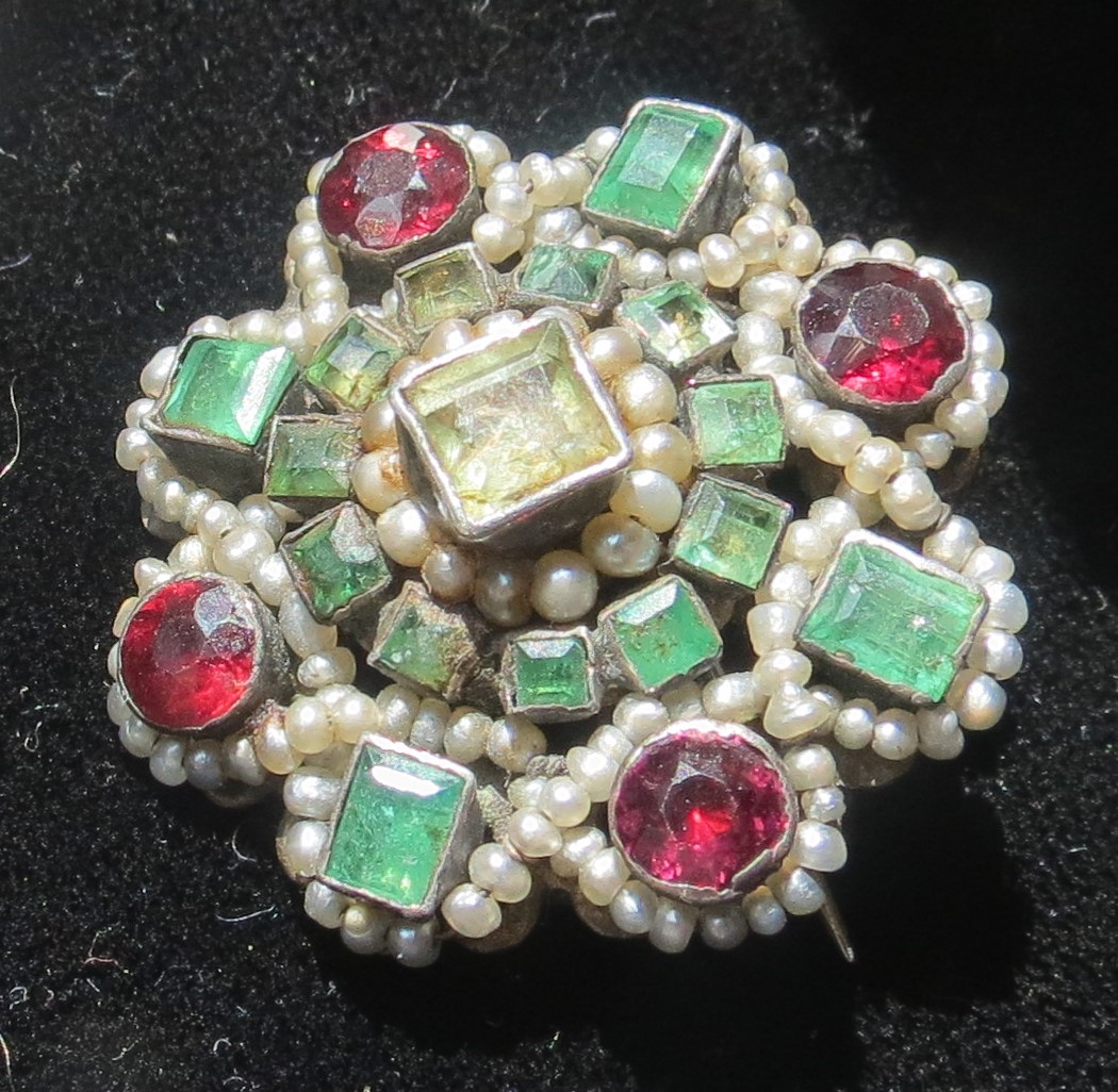 Georgian Pearl, Emerald, Peridot & Rhodolite Garnet Brooch