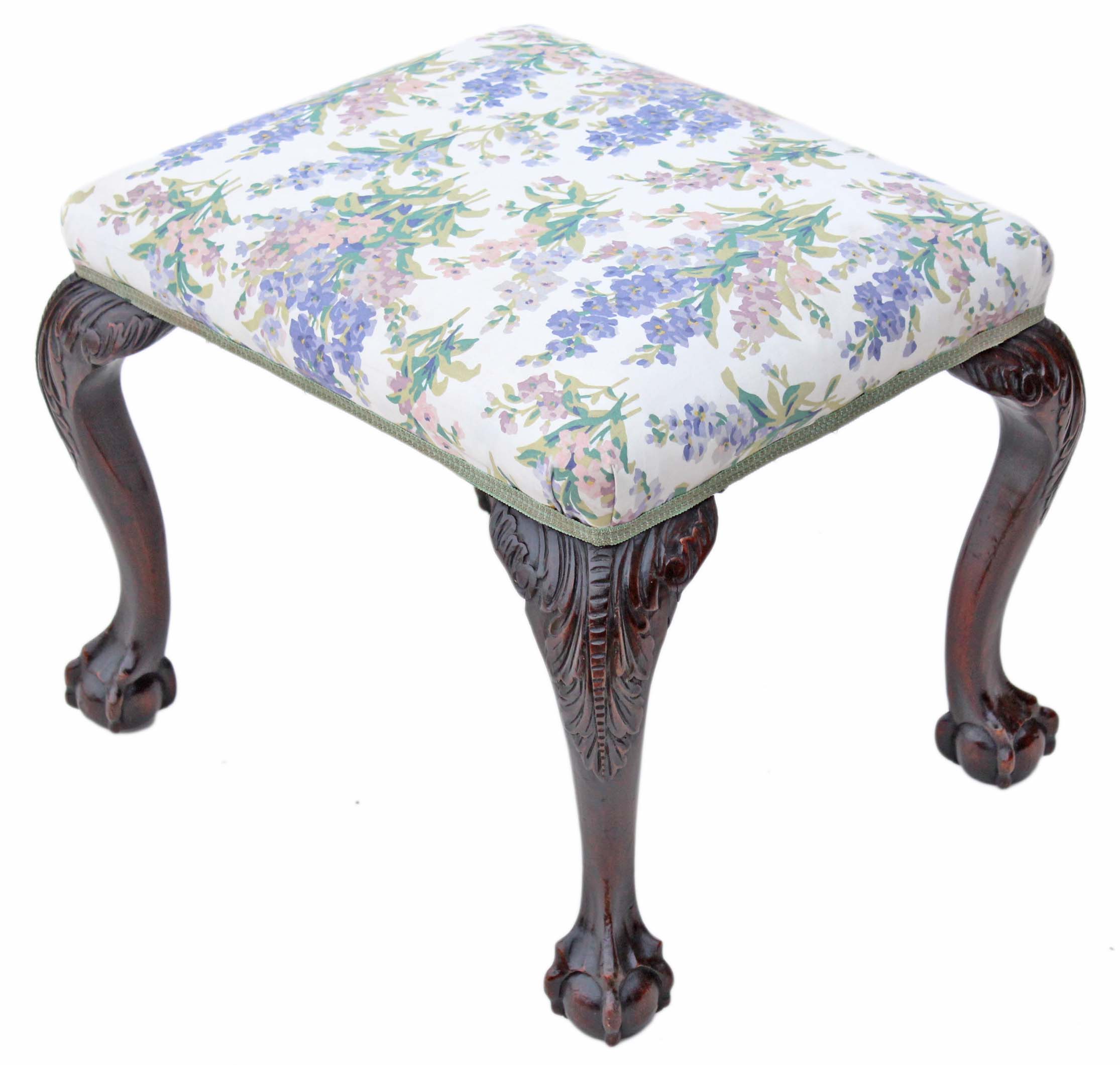 Georgian Revival Carved Mahogany Upholstered Stool / Foot Chair