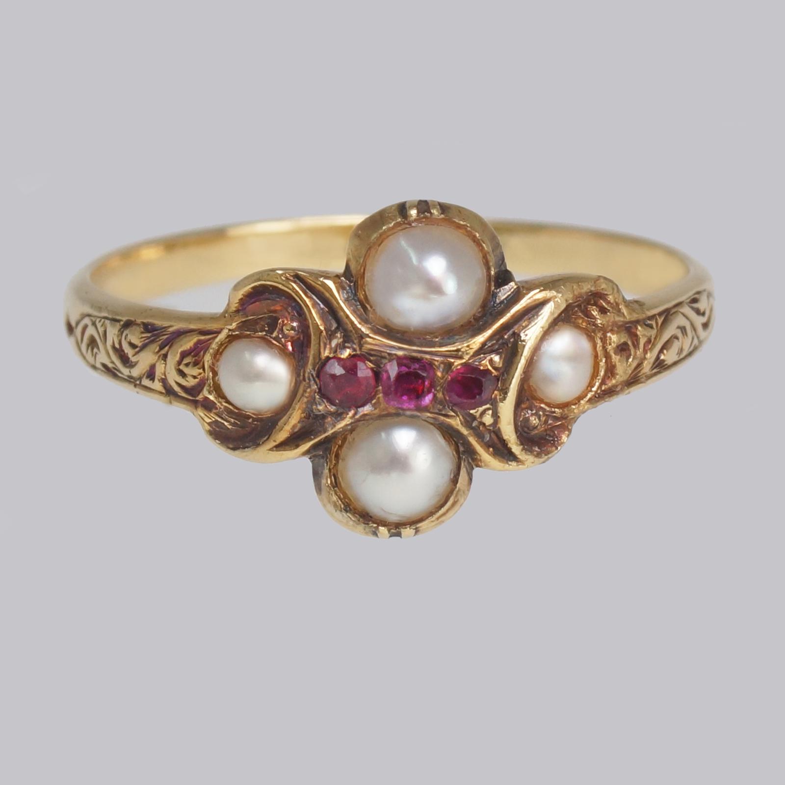 Georgian Ruby & Split Pearl Ring Antique 15ct Gold Ornate Cluster Ring ca 1820