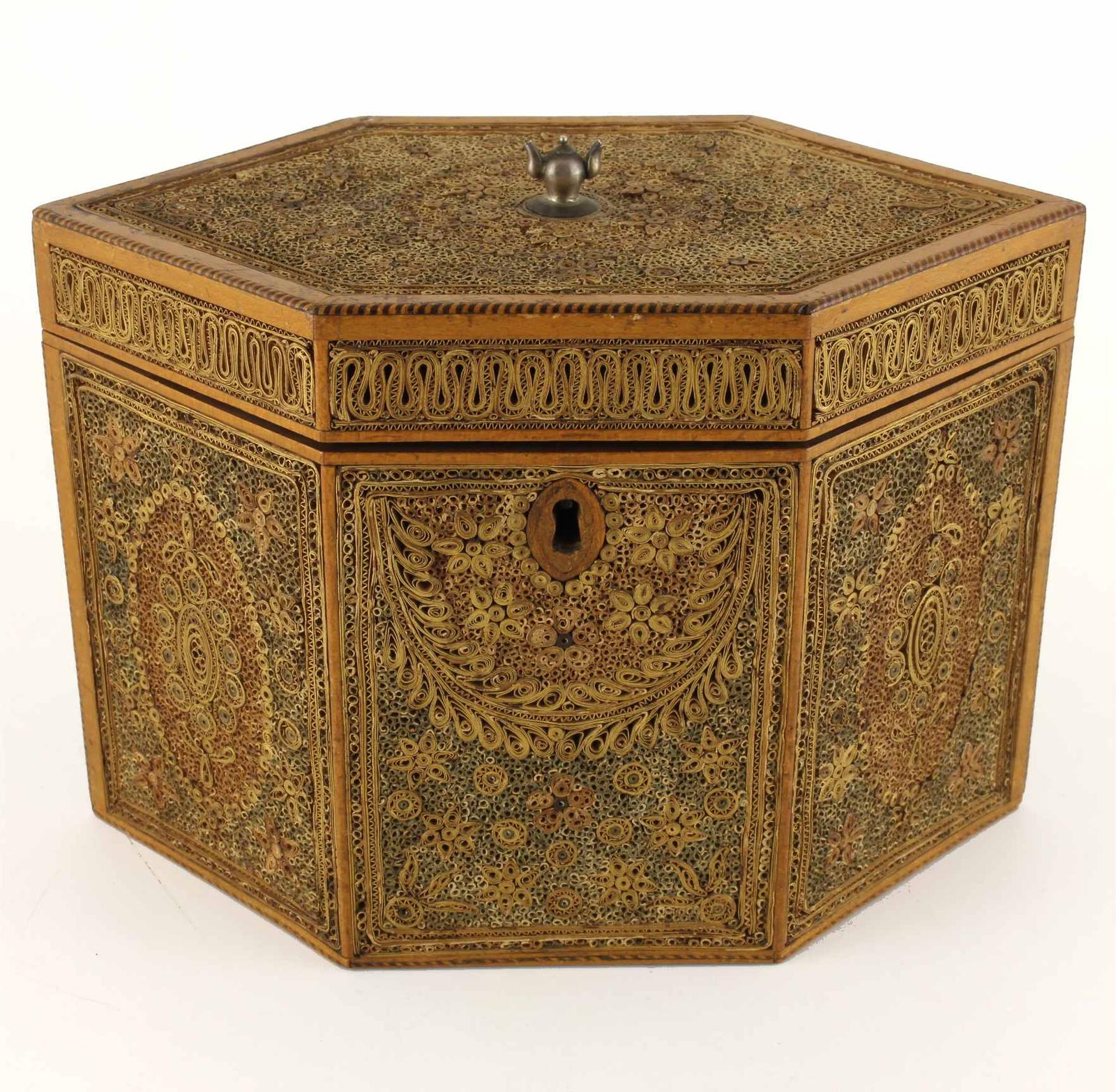 This fabulous Georgian scrollwork tea caddy which dates from c1790 is hexagonal in shape and has been skilfully hand decorated with very fine and intricate detail using gilt rolled paper (quill work).