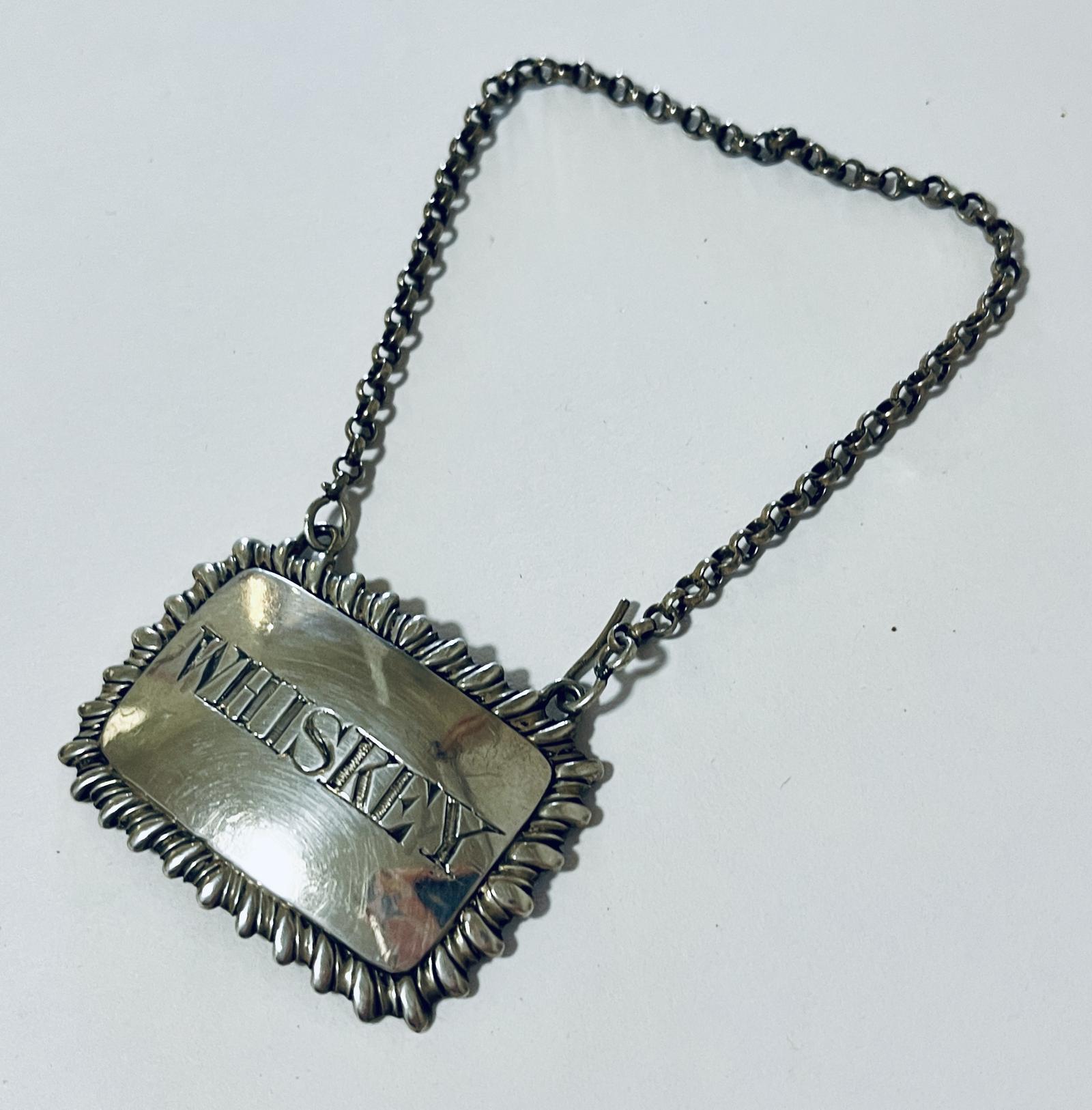A fine example of an antique Sterling Silver decanter label for "WHISKEY". The label is an attractive shape with gadrooned border and hangs on a silver chain.