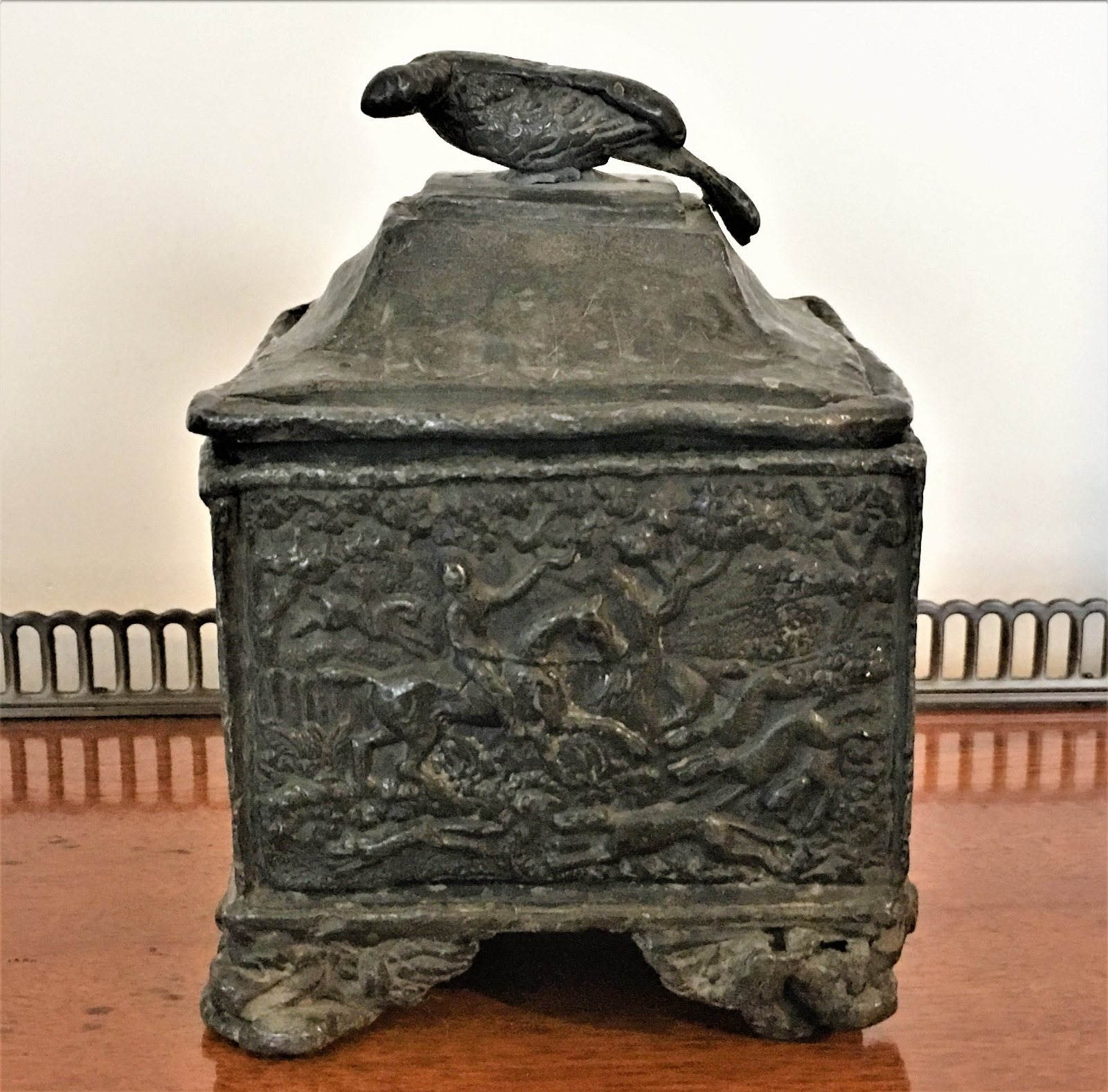 Georgian Square Formed Lead Tobacco Box Decorated with Hunting Scenes C.1800