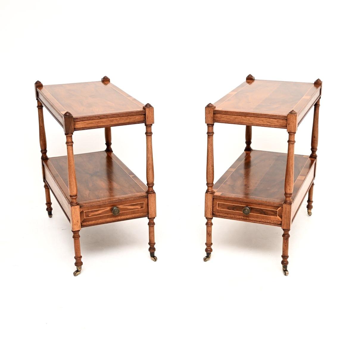 A beautiful pair of 'Georgian style' inlaid yew wood side tables. They were made in England, they date from around the 1930s.